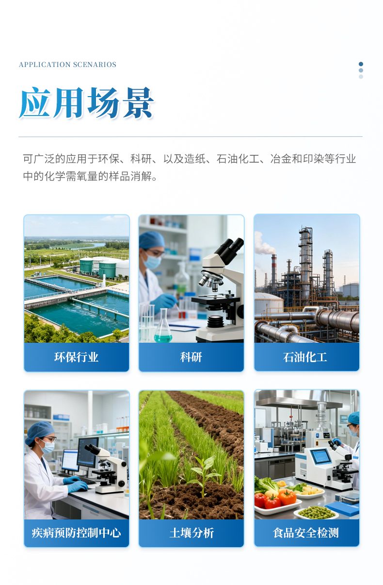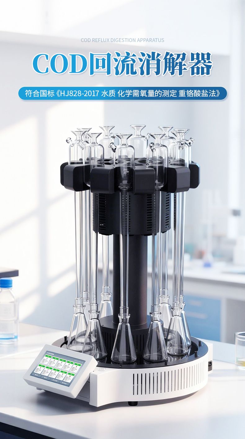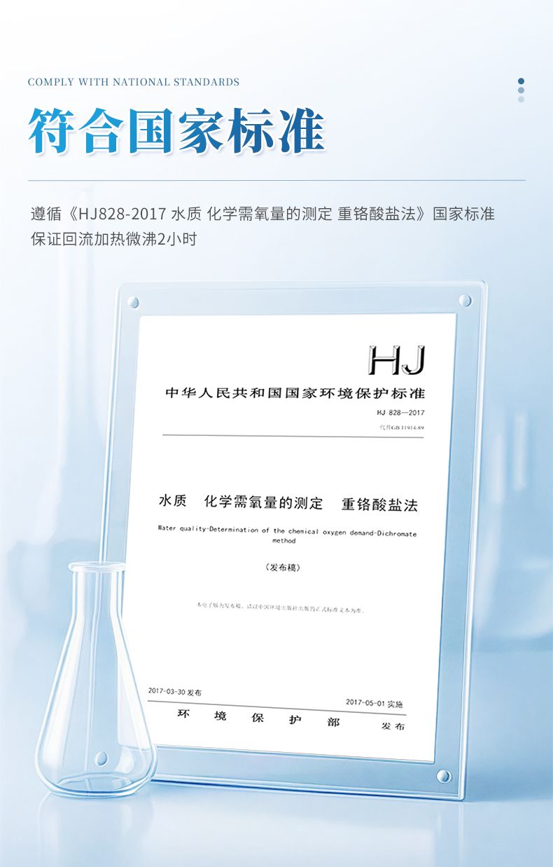 化学需氧量(COD)智能回流消解器遵循了国家标准《HJ828-2017 水质 化学需氧量的测定 重铬酸盐法》的基本原则,保证了回流加热微沸2小时的消解操作,试剂溶液的配制和加入量与国标法一致,确保可靠准确的分析结果。