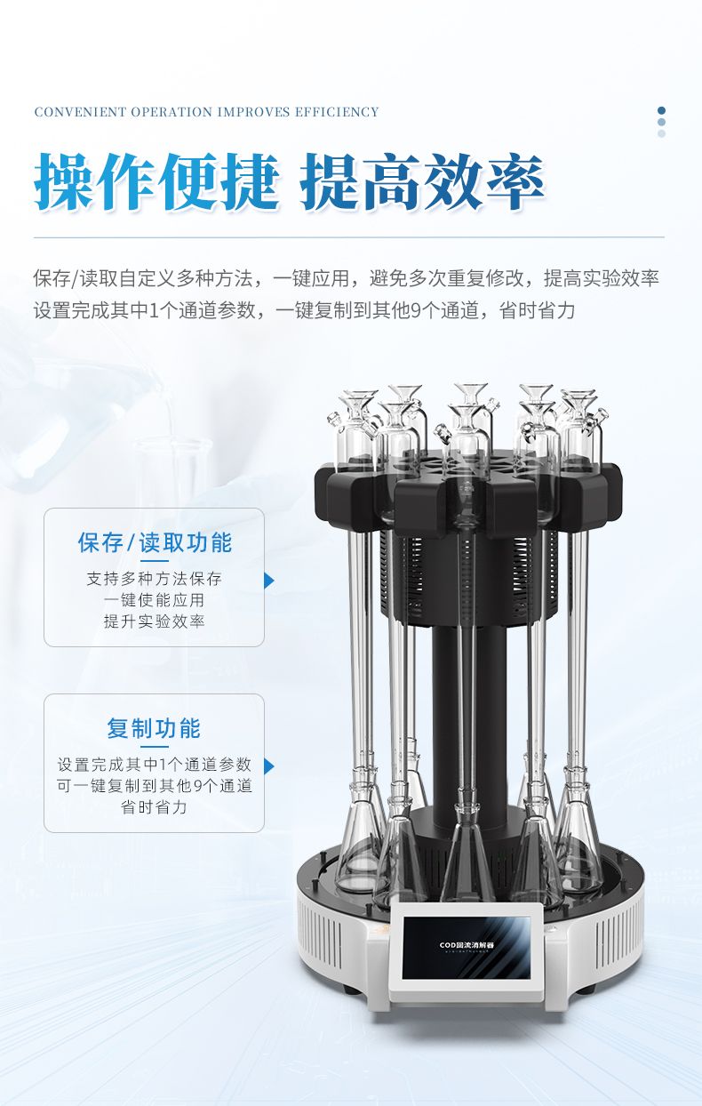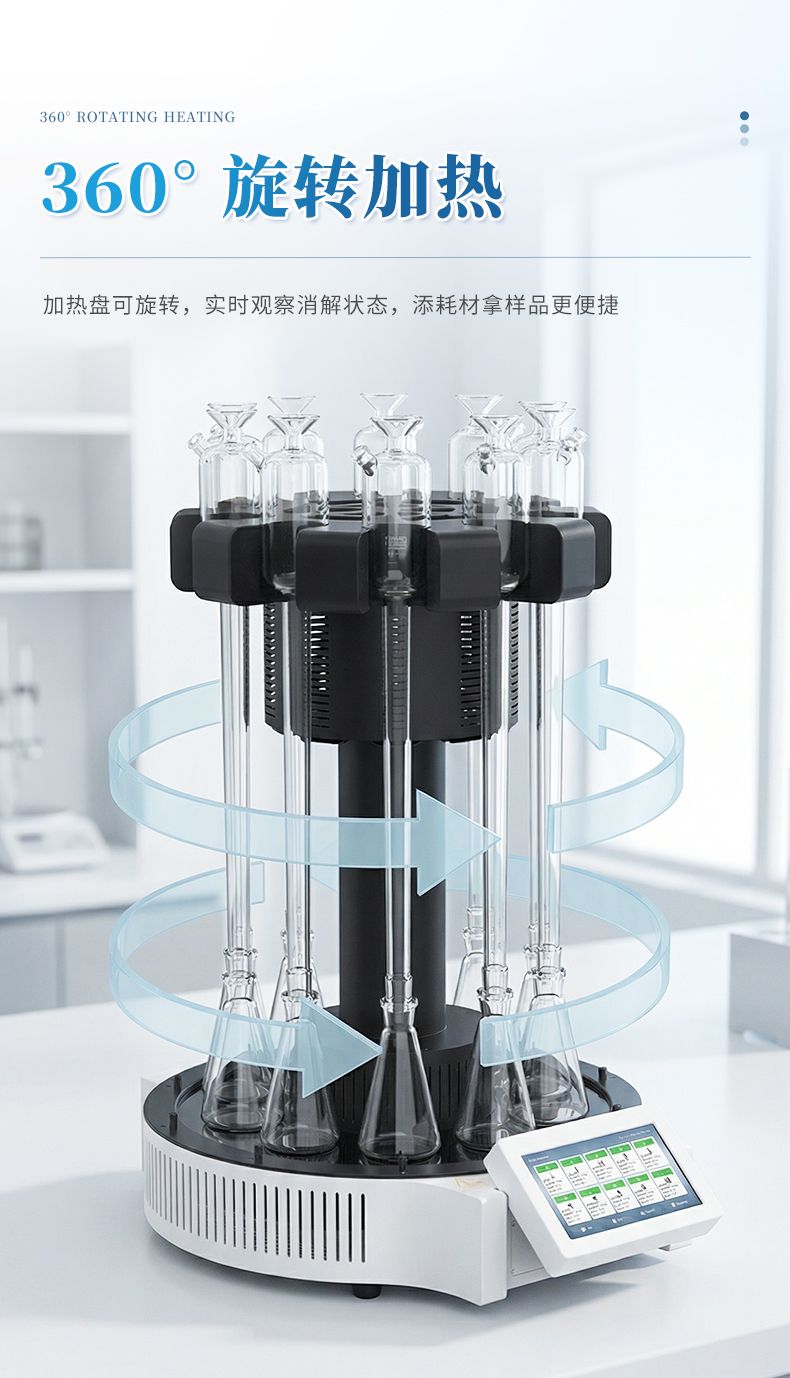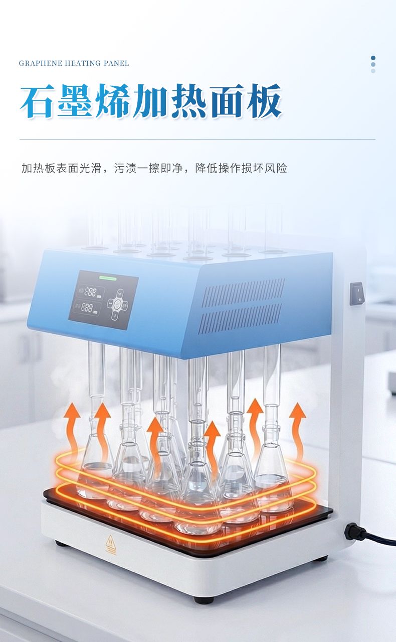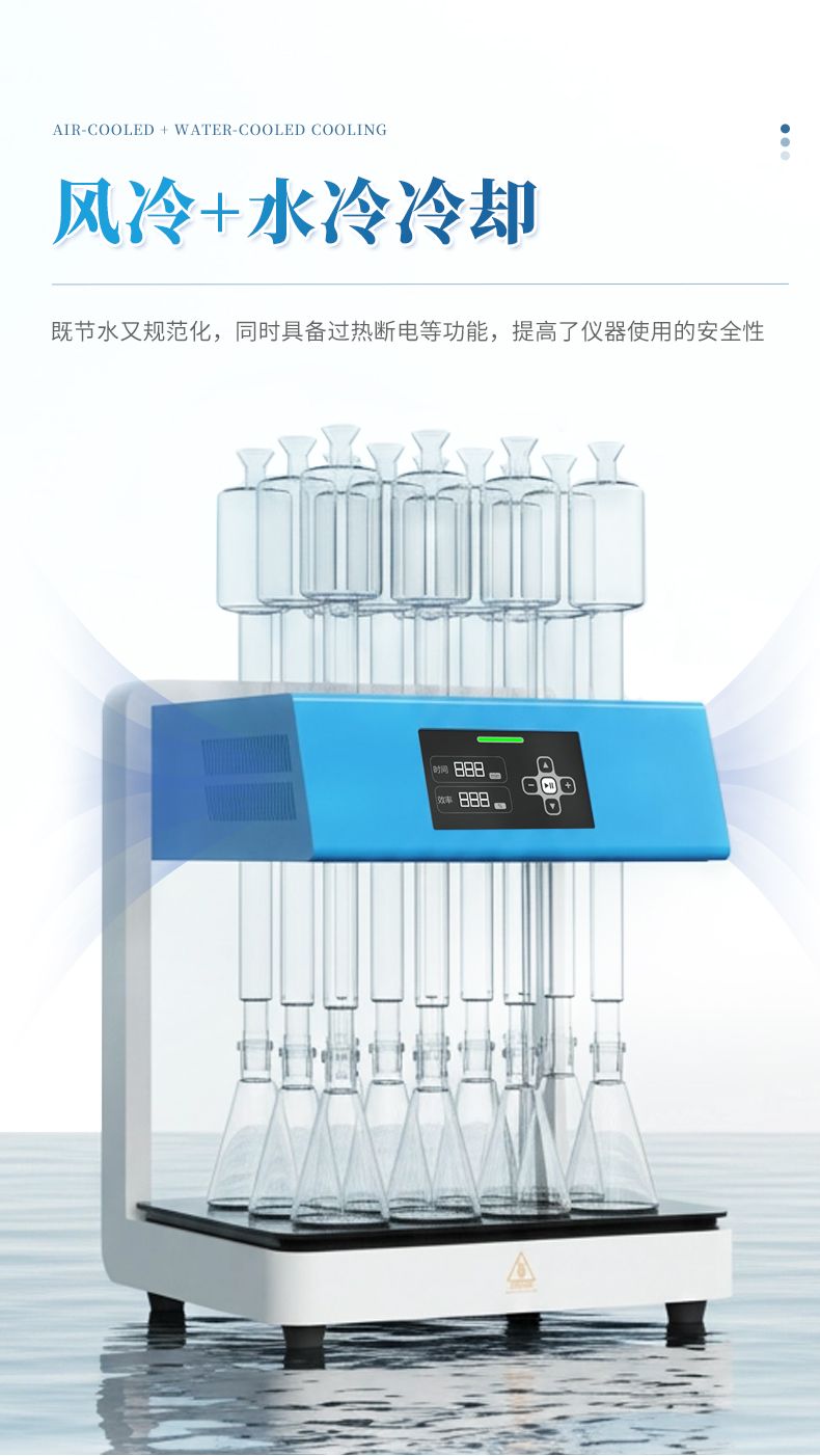 3. 安全性能优:采用玻璃毛刺回流管代替球形回流管,并以风冷+水冷技术取代传统自来水冷却方式,既可以节水又能使仪器规范化,同时具备过热断电等功能,提高了仪器使用的安全性。 4.面板易清洁:采用石墨烯加热板,表面光滑、平整,表面污渍一擦即净,可减少操作不当对仪器的损坏;