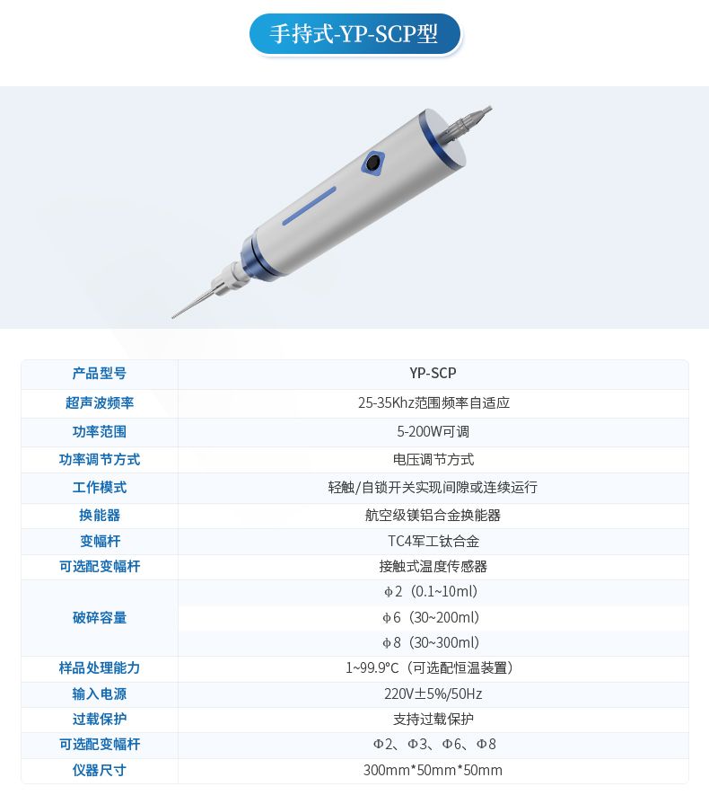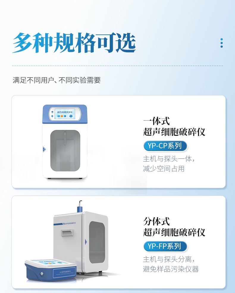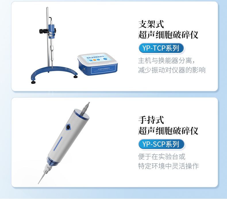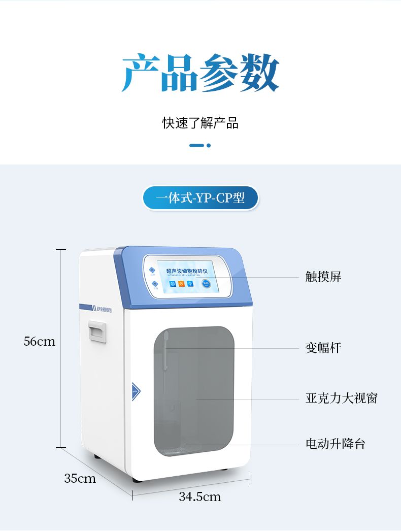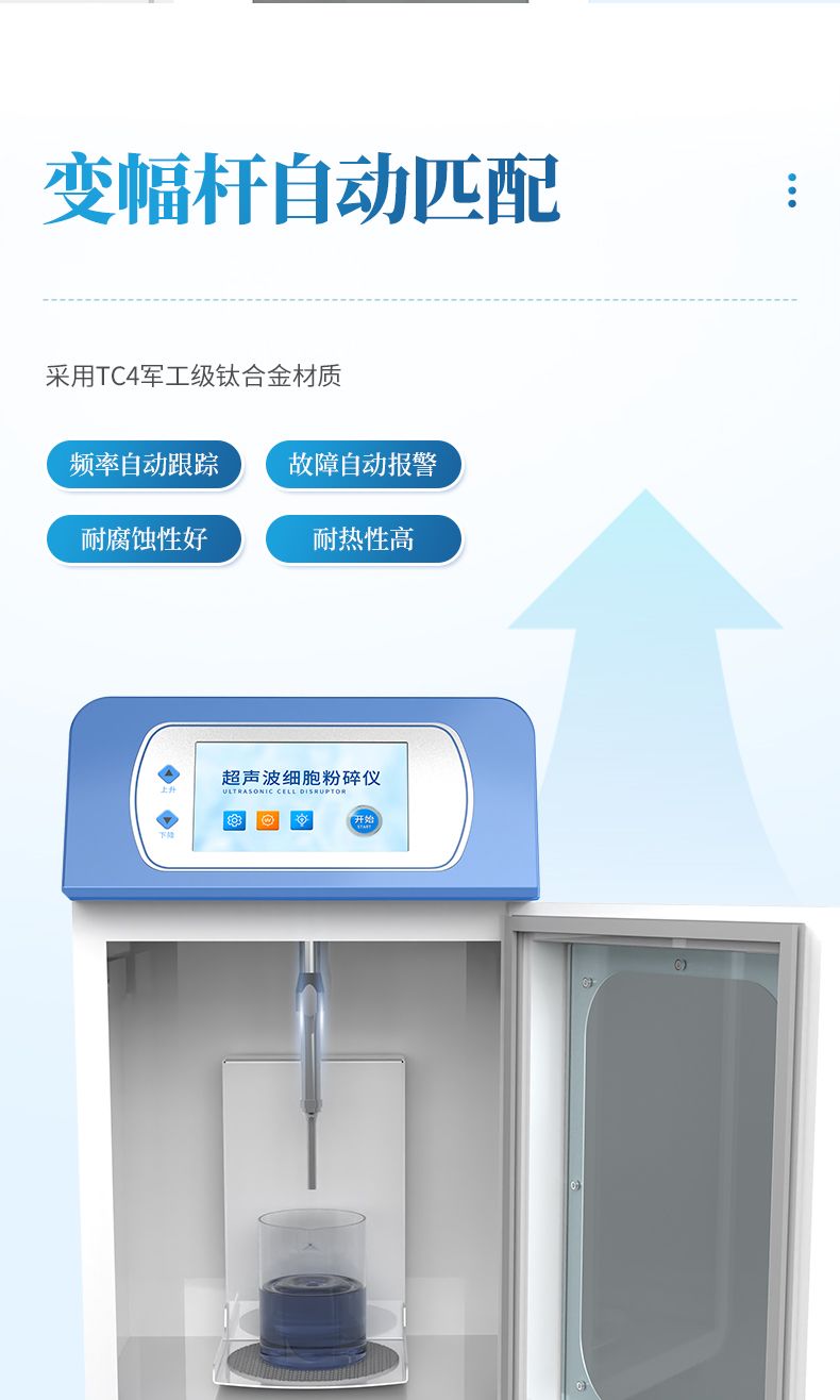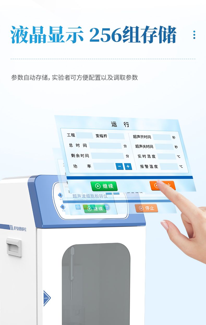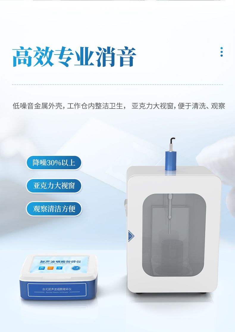 自研自产的超声波细胞破碎仪功能齐全、外观新颖、性能可靠,仪器采用大屏液晶显示;中央微机集中控制,超声输出、间隙时间、超声功率,样品温度监测显示,频率自动跟踪,故障自动报警等功能。适用于生物化学、微生物学、药物化学、表面化学、物理学、动物学、农学、医学、制药等领域的教学、科研及生产。