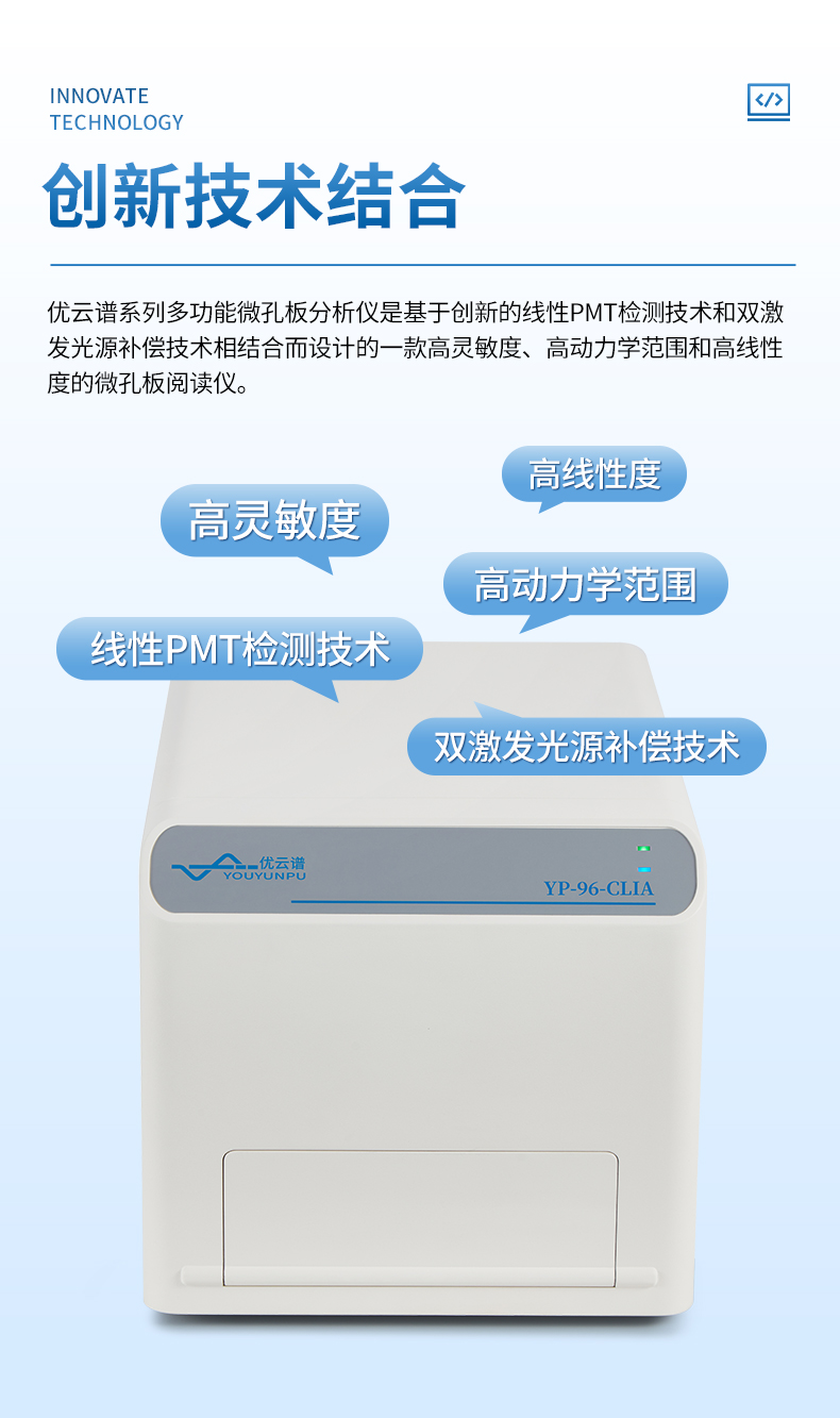 优云谱系列多功能微孔板分析仪是基于创新的线性PMT检测技术和双激发光源补偿技术相结合而设计的一款高灵敏度、高动力学范围和高线性度的微孔板阅读仪。根据不同配置,可以实现化学发光(CLIA)、光激化学发光(LiCA)和时间分辨荧光(TRF)三种检测模式。可灵活配置1到3种检测模式,为研究人员提供一种灵活的解决方案。