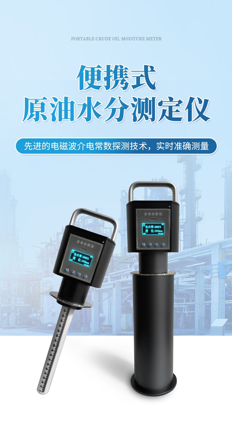 便携式原油含水测定仪采用了先进的电磁波介电常数探测技术及德国专用芯片,使该仪表具有智能化、小型化的特点。实现了原油含水率实时准确测量,打破了外国公司对该产品的技术和价格垄断。该产品专门针对我国原油粘稠度高、高含水、高含蜡的特点设计独特的探测头和分体结构,采用了各项工艺措施,完全适应我国各大油田的原油含水率的化验测量。传感器探头采用 3特氟龙材料制作,耐高温、酸、碱、硫化气体的腐蚀,不易结垢、结蜡,从而保证了仪表测量数据的准确性和稳定性,可广泛使用于我国各大油田的化验室。