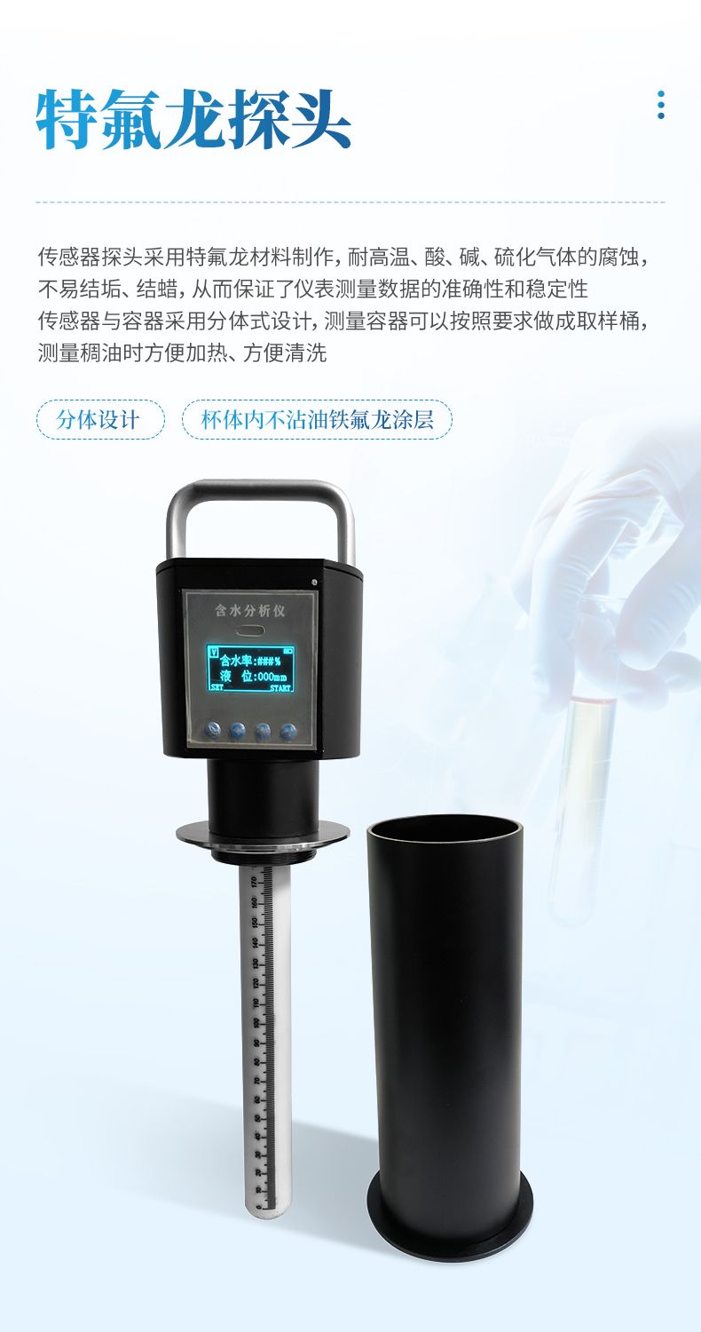 4、使用过程中省去了较耽搁时间的冷冻去明水,均匀搅拌、蒸馏、人工计算等流程。将测量探头插入取样量杯(量杯可以直接用取样筒代替)中就可以迅速给出测量出结果。