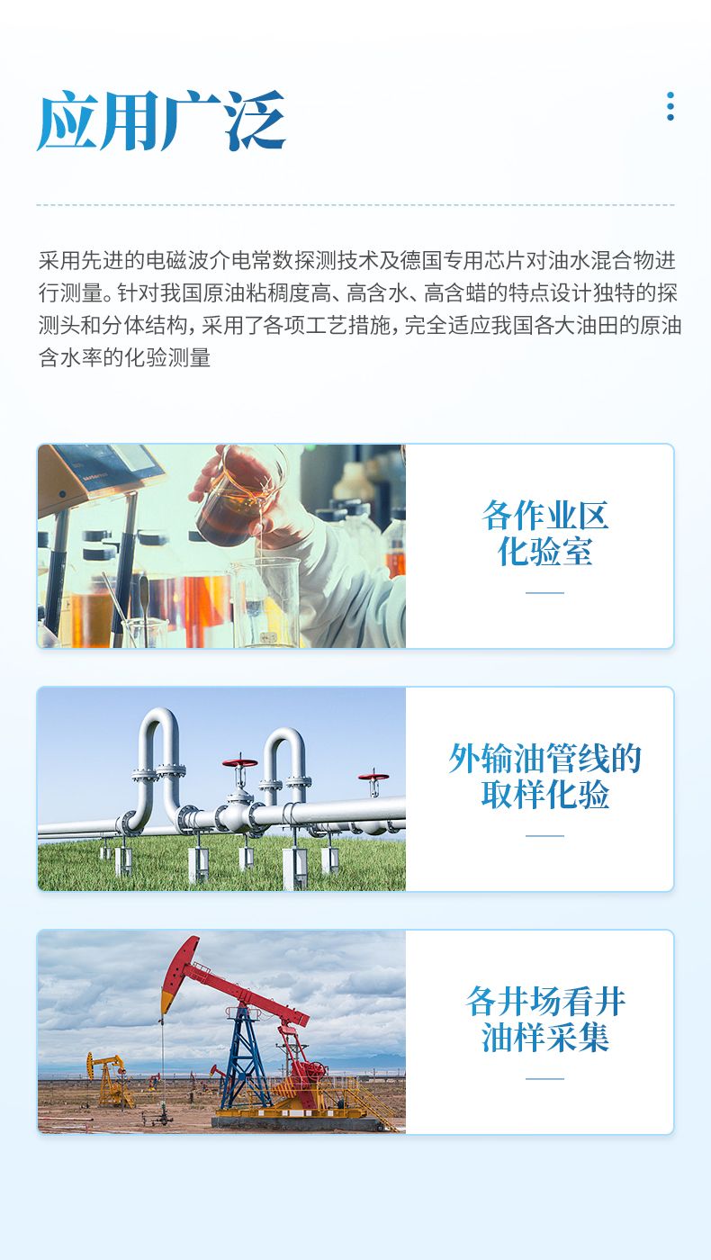 快速原油含水测定仪可用于各作业区化验室对井口取样的批量含水率的化验分析。作业区化验室担负着整个作业区各个井口油样和管线取样液体的含水率的化验工作,其工作量巨大,采用便携式快速原油含水测定仪测量一个油样只需要 10 几秒种,大大提高了工作效率,原来一天需要几个化验员的工作量,现在一个人几个小时就可以完成,大大的降低化验员的劳动强度,提高效率,降低了企业用工成本。