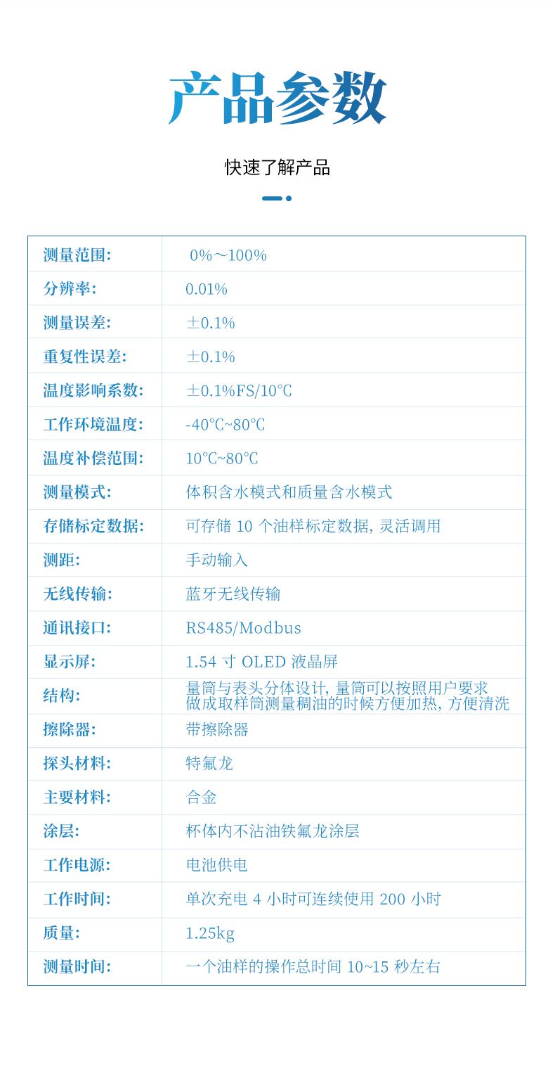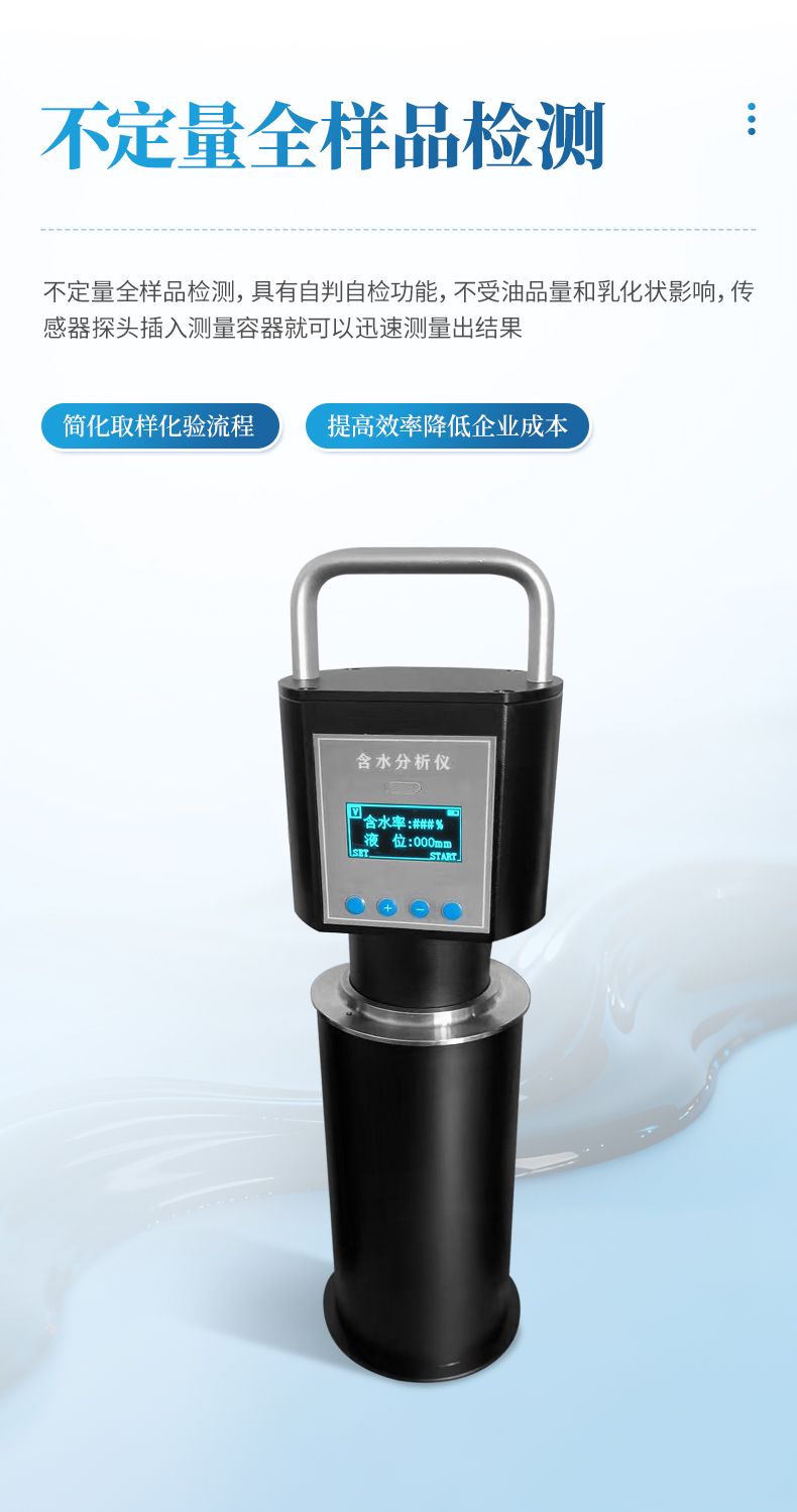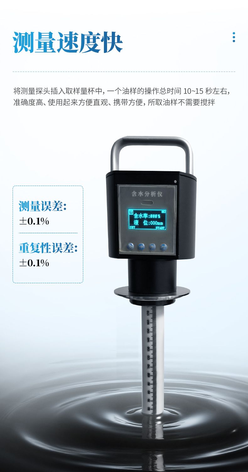 1、测量稀油的时候 10 秒就可以看结果,测量稠油时,如果是低含水 30%以下时间一般也是 10 秒左右,如果是高含水的话,测量时间尽量长一点,按实验数据看一般 1-2 分钟左右,具体多长时间要根据现场稠油的粘度来定。