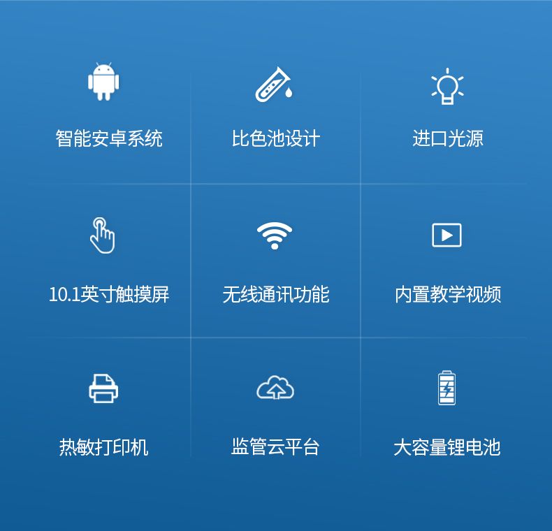 检测仪主机x1,6孔消解仪x1,比色管夹具x1,数据线x1,充电器x1,高锰酸盐指数预制试剂x1,5ml移液器x1,1ml移液器x1,5ml枪头盒x1,1ml枪头盒x1,冷却试管架x1,比色瓶x8,比色管x4,滤纸x1,擦镜布x2,丁腈手套x1,手提配件箱x1,说明书x1,合格证/保修卡x1,蓝牙打印机x1(选配)。