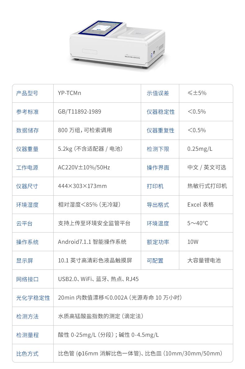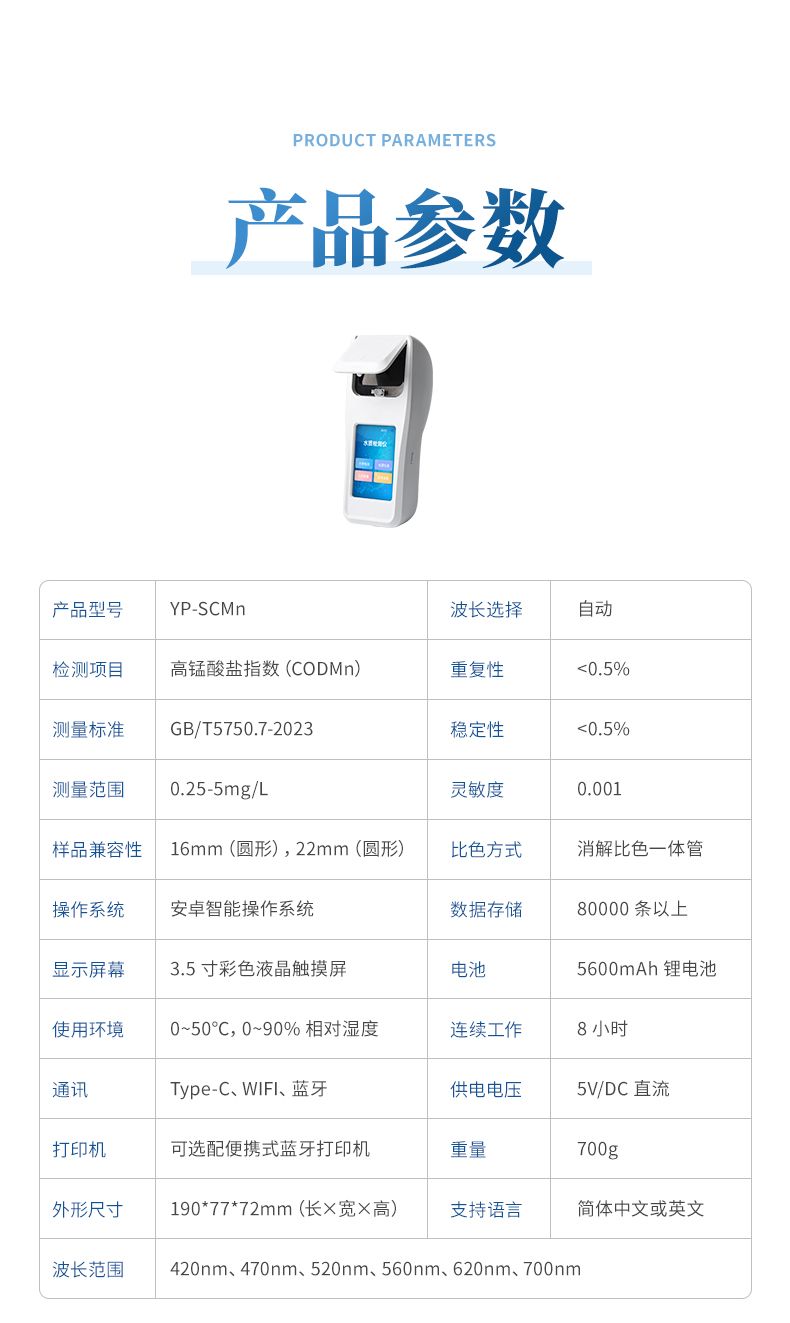手持式高锰酸盐指数测定仪是依据最新的生活饮用水标准检验方法《GB/T 5750.7-2023》设计制造。本仪器主要检测水质高锰酸盐指数浓度指标;仪器配备高清晰度彩色液晶触摸显示屏,Android智能操作系统,中文显示界面,中英文键盘,人性化操作,使用更简单;搭配6孔智能消解仪,可实现户外快速检测。