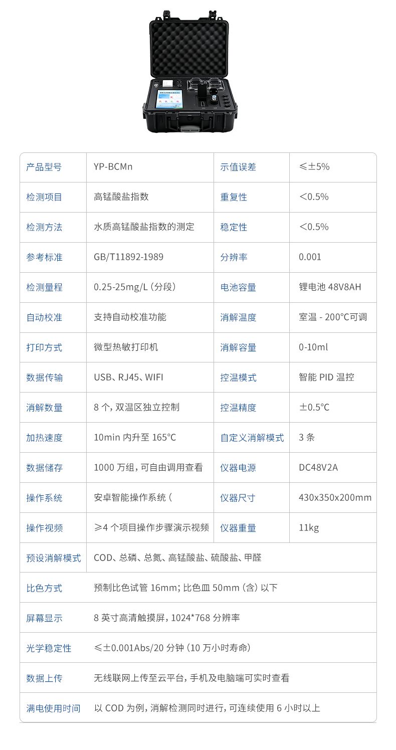 4.便携一体式检测设备,内置大容量锂电池,可一机实现户外水样消解、测定;