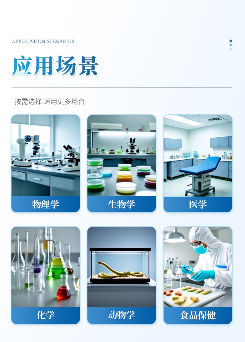 高效快速为科研实验、生产制造等领域提供高精度恒温、保温环境,可扩展第二恒温、保温环境,可被广泛应用于物理学、生物学、医学、化学、动物学、法医鉴定、食品保健品等行业。