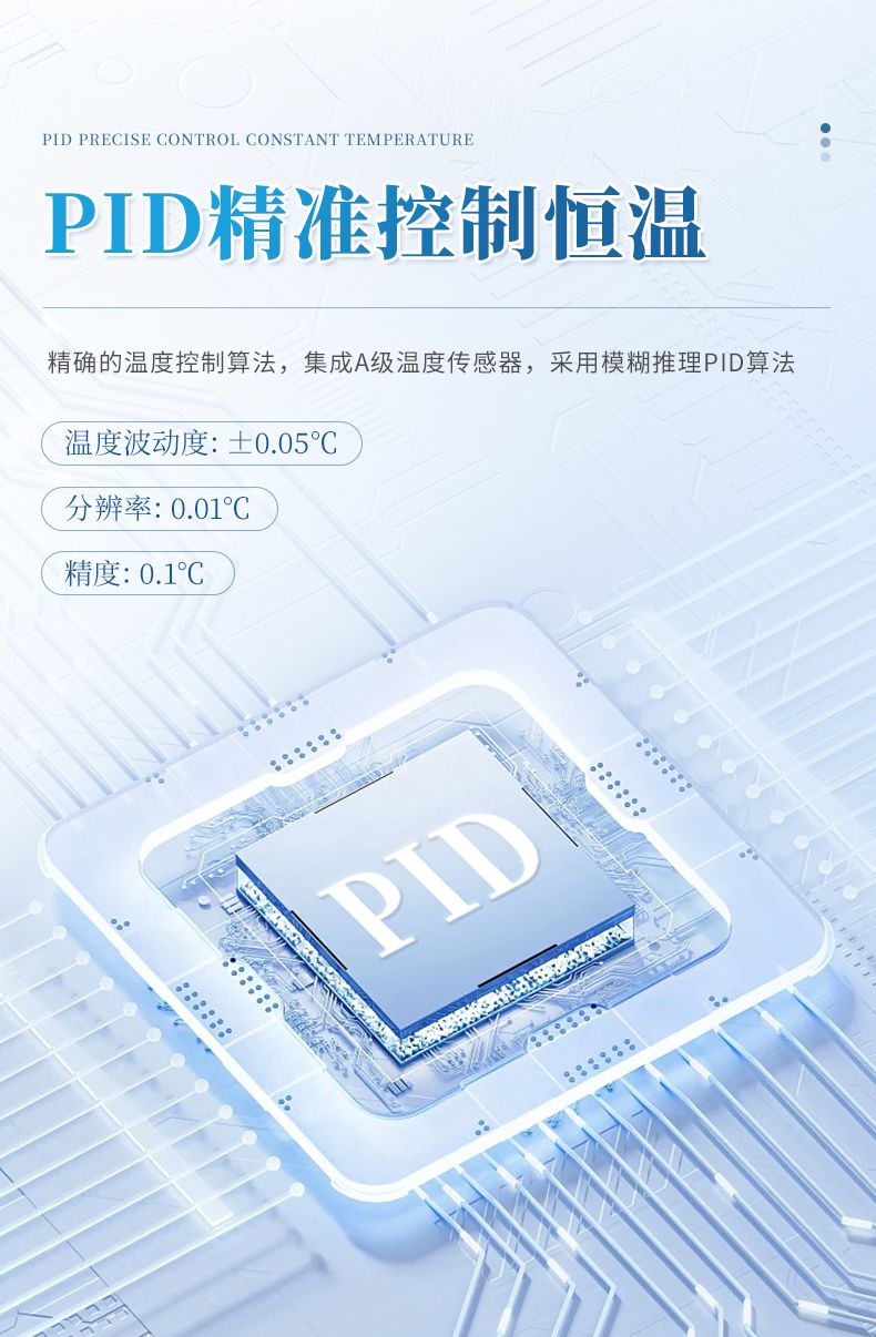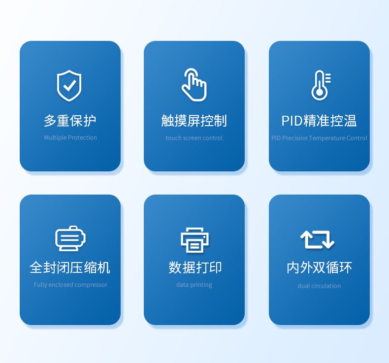 采用低噪声全封闭压缩机组,配合低温制冷剂提供快速制冷控制,采用高功率加热模块提供加热控制,根据目标温度值利用模糊推理、PID算法等实现恒温控制。采用轴式搅拌装置,同时可提供内外循环,使温度均匀并提供第二恒温场。