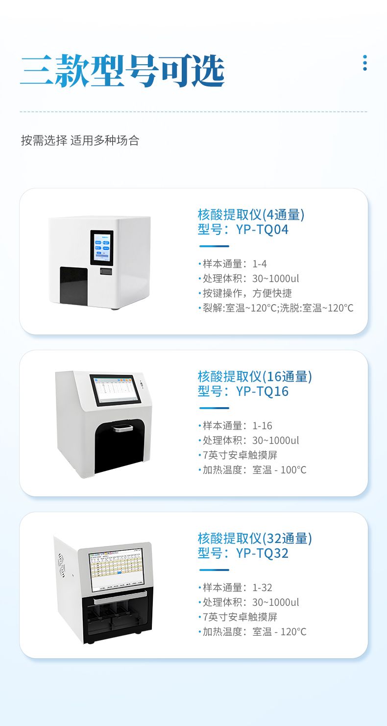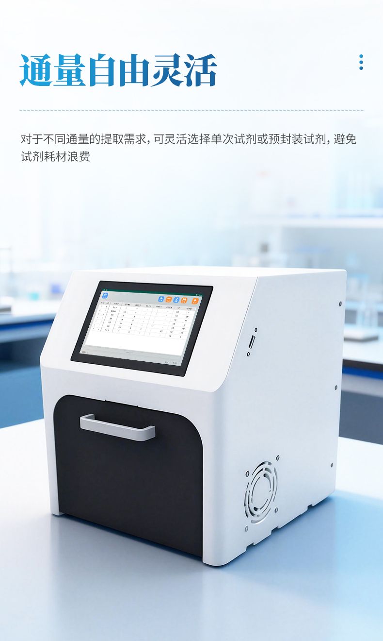 核酸提取仪通过磁珠法提取核酸,选择相应的试剂盒就可以自动的从多种样品材料如血液、组织、细胞中分离纯化高纯度的核酸。具有兼容性强(适配预封装提取试剂盒,也可适配单头份试剂)、提取速度快、提取回收率高、操作简便的优点,是分子生物学实验室检测试验的得力“助手”。可广泛应用于科学研究、分子诊断、动植物疫病检测等领域。