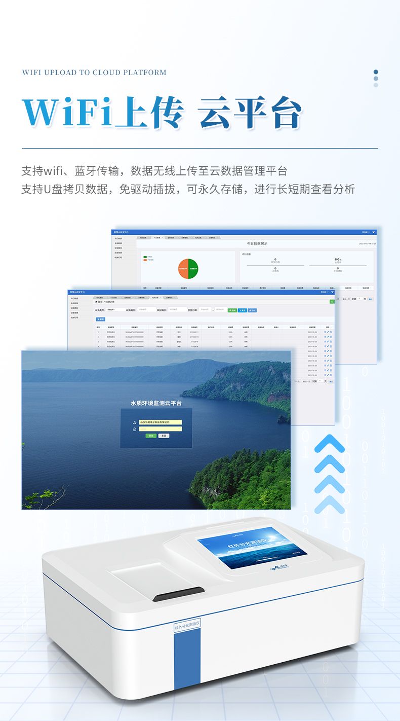 6)强大的后台数据支持,用户检测完样品后,不但可以通过打印机打印结果和保存在本地,还可以通过WIFI或4G连接互联网上传到云平台数据库中;
