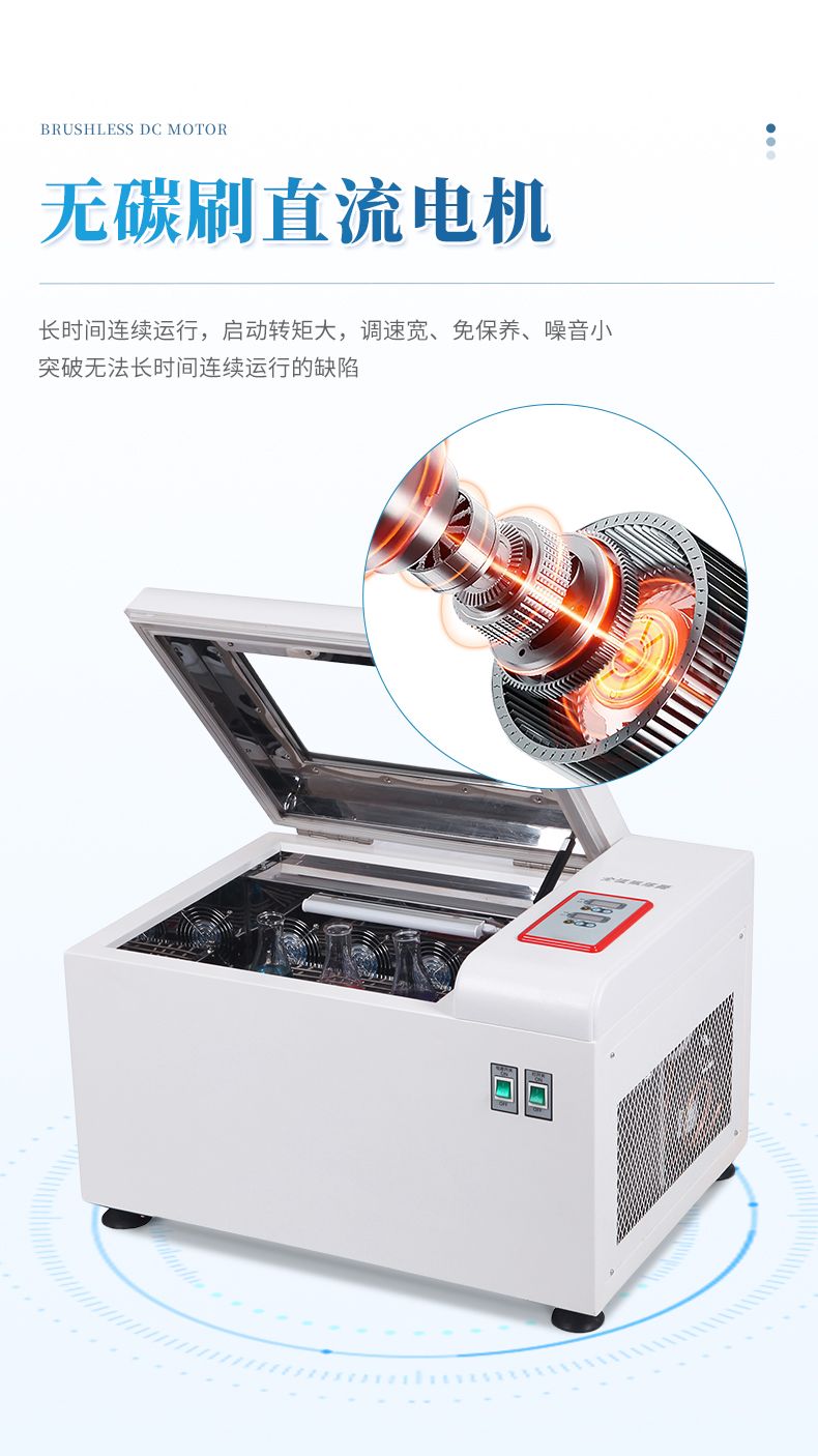 台式恒温小型振荡器专为需求用地面积小的用户设计。具有小外形体积,大工作空间的特性。可以放置在坚固的台面或地面。该型摇床装备PID控温系统和无刷直流电机控制系统,可满足对温度和速度有较高要求的用户需求。