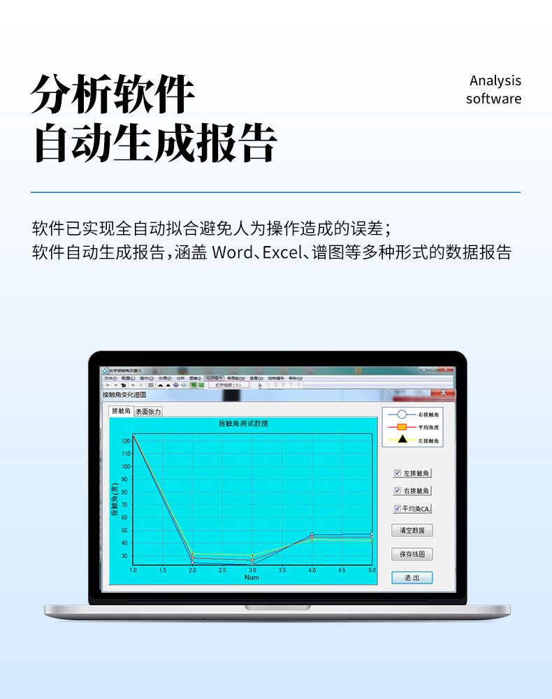 6.分析软件功能强大:具备一键式全自动拟合能力,具备国际最领先的拟合方法,满足各种液滴形态的精确拟合;