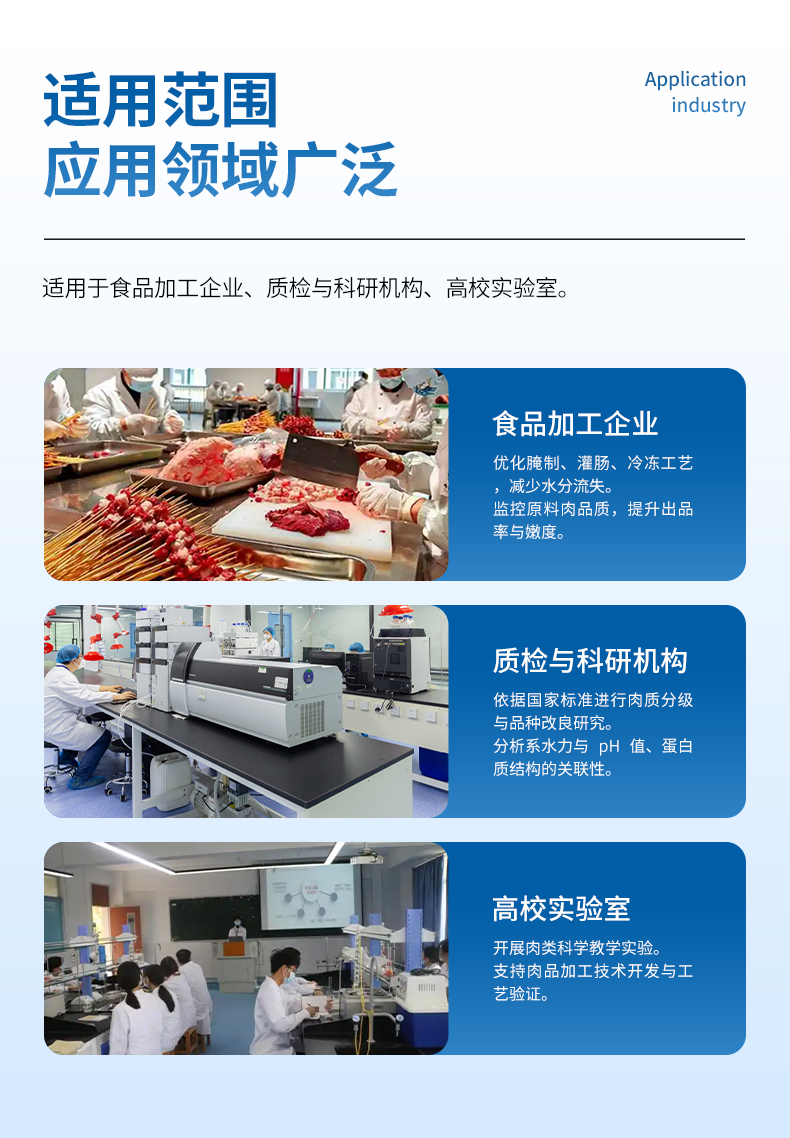 肌肉系水力的高低,取决于宰后肌肉的 PH。国内通常采用加压重量法来度量肌 肉失水率,以估计肌肉的系水力,即失水率越高,系水力越低。系水力(%)=(压前肉样重-压后肉样重)一压前肉样重 x100%。系水力:指肌肉蛋白质在外力作用 下保持水分的能力采用贮存损失 熟肉率及失水率测定肌肉的系水力。应用于食品包装厂家、质检、商检、大学、 科研等部门。