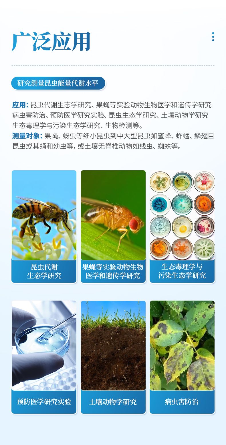 测量对象:果蝇、蚜虫等细小昆虫到中大型昆虫如蜜蜂、蚱蜢、鳞翅目昆虫或其蛹和幼虫等,或土壤无脊椎动物如线虫、蜘蛛等。