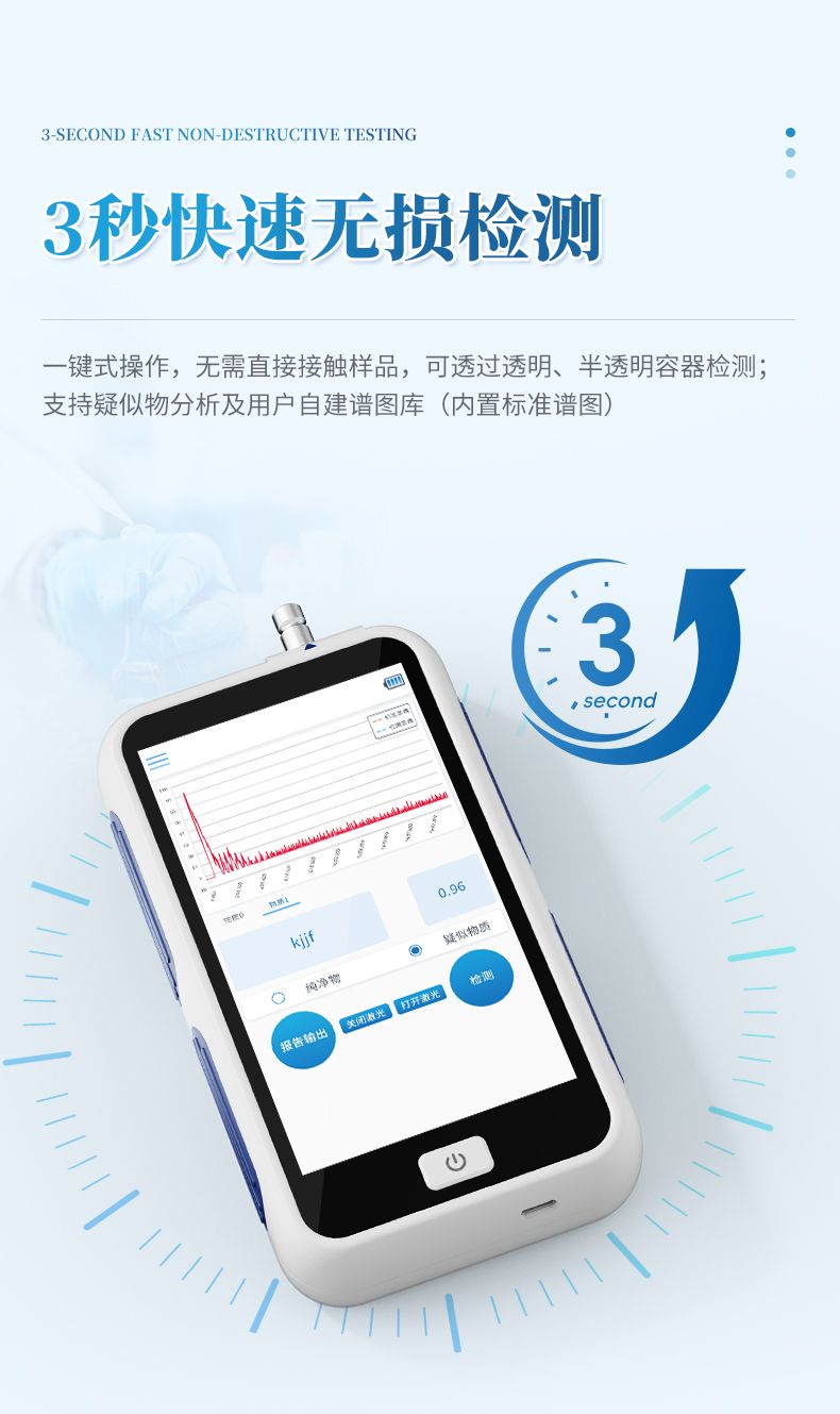 高效检测:一键式操作,3秒内完成光谱采集(500ms积分时间),无需直接接触样品,可透过玻璃、塑封袋、饮料瓶等透明、半透明容器检测;支持疑似物分析及用户自建谱图库(内置标准谱图);