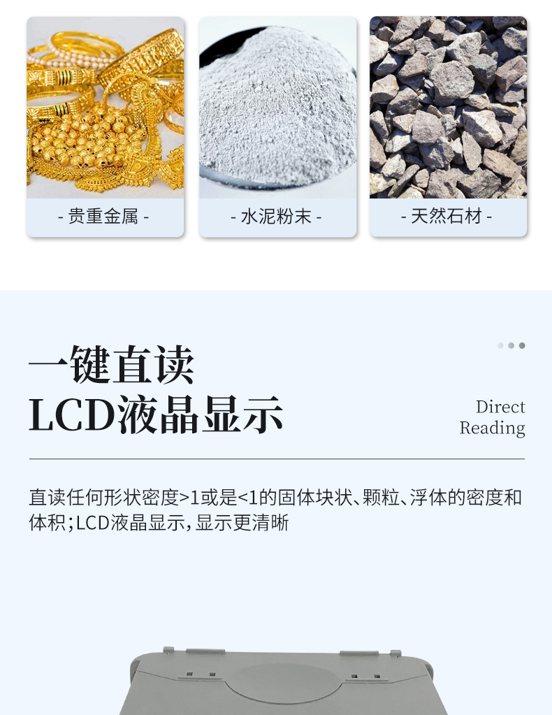 1.直读任何形状密度>1或是<1的固体块状、颗粒、浮体的密度和体积