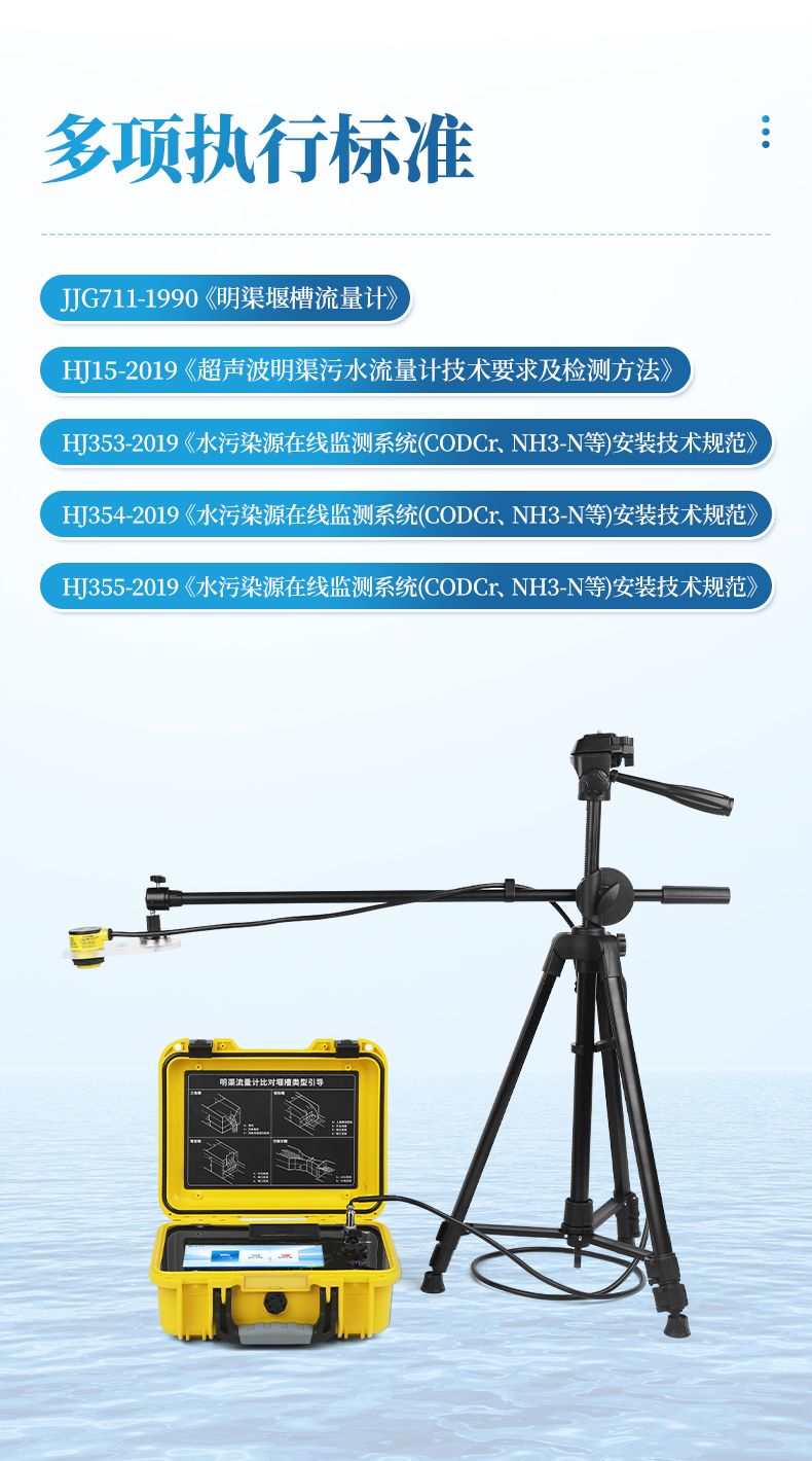 便携式明渠流量计是专为水文监测、江河流量监测、农业灌溉及市政给排水等行业设计的一种高精度测量仪表,它采用超声波技术和特殊的微功耗设计方案,结合全数字信号处理技术,确保了测量的稳定性与可靠性。该设备具有广泛的测量范围和较高的测量精度,支持实时数据显示、数据记录、导出及打印等功能,操作简便且准确度高,非常适合于需要频繁移动进行测量的场合。同时,它依据JJG711-1990检定规程,并参照HJ353-2019、HJ354-2019、HJ355-2019以及HJ15-2019中对流量监测单元的相关要求进行比对验收,确保了其在水利工程、环境监测、农业灌溉等领域的适用性和准确性。
