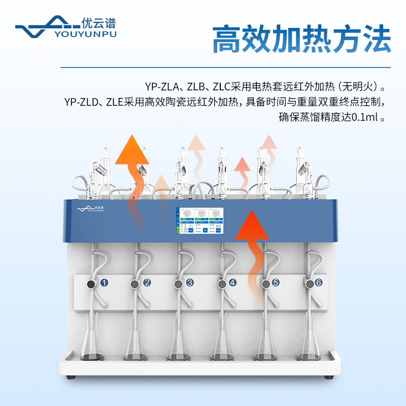 3、加热模块采用远红外陶瓷辐射加热方式,碗状加热热源设计,确保样品容器(圆底烧瓶)与热源密切贴合,加热功率调节范围广、加热均匀性好、热辐射效率高,蒸馏速度快、使用寿命长。