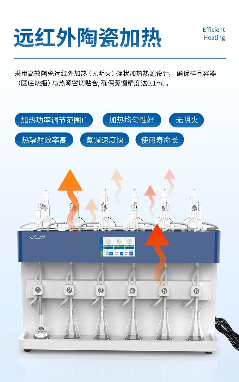 3、加热模块采用远红外陶瓷辐射加热方式,碗状加热热源设计,确保样品容器(圆底烧瓶)与热源密切贴合,加热功率调节范围广、加热均匀性好、热辐射效率高,蒸馏速度快、使用寿命长。