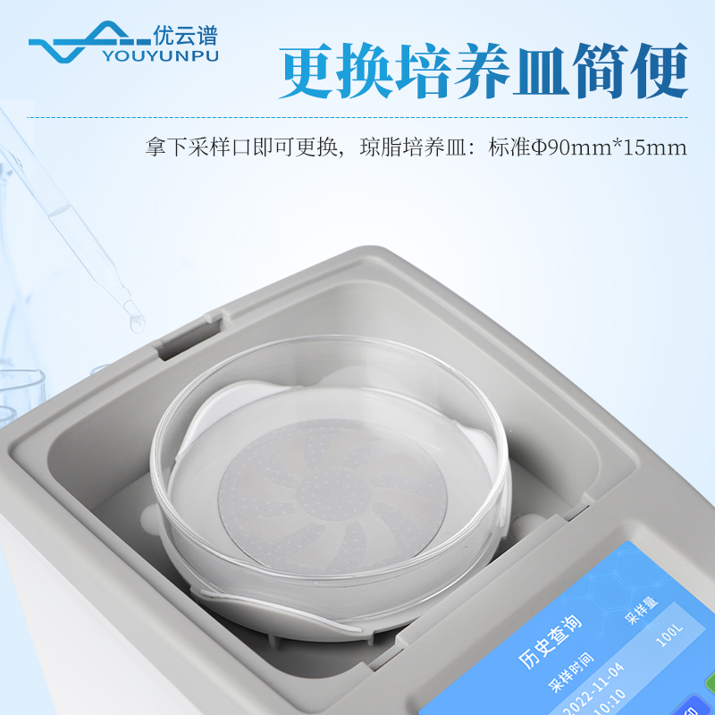 ● 更换培养皿简便,拿下采样口即可更换培养皿。