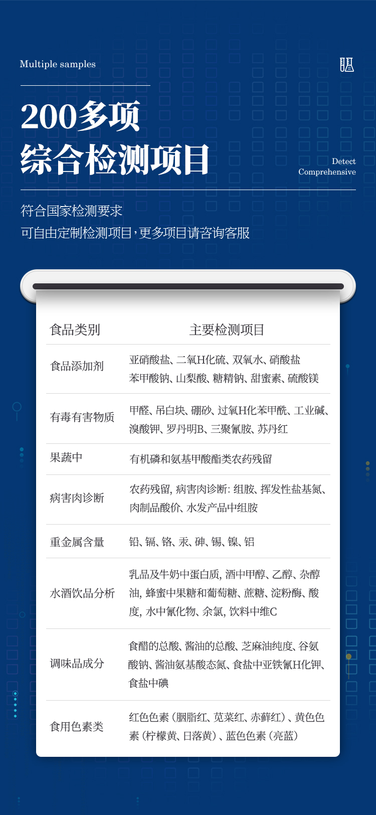 多功能食品安全检测仪可快速检测60多项目,包含:滥用食品添加剂、非食用化学物质、农药残留、重金属含量、病害肉成分、营养强化剂、化学类残留、食用油脂检测、水酒饮品分析、调味品成分、食用色素等现场的定性定量检测。