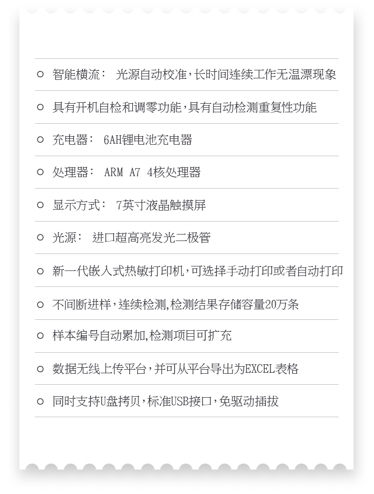 5、配备新一代嵌入式热敏打印机,可选择手动打印或者自动打印,检测完成可自动打印检测报告和二维码。