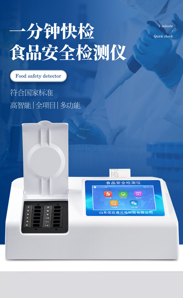 该多功能食品安全检测仪为集成化食品安全快速检测分析设备,广泛应用于食药监局、卫生部门、高教院校、科研院所、农业部门、养殖场、屠宰场、食品肉产品深加工企业、检验检疫部门等单位使用。