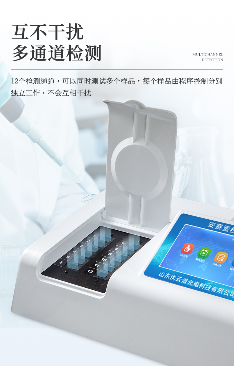 3、检测通道:≥12个检测通道,可以同时测试多个样品,每个样品由程序控制分别独立工作,不会互相干扰。