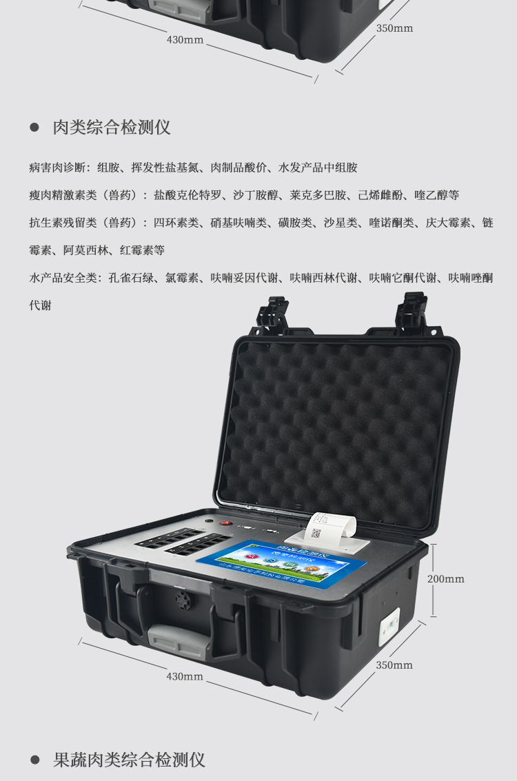 该多功能食品安全检测仪为集成化食品安全快速检测分析设备,广泛应用于市场监管局、食品肉产品深加工企业、学校食堂、卫生部门、畜牧部门、屠宰场、检验检疫部门等单位使用。
