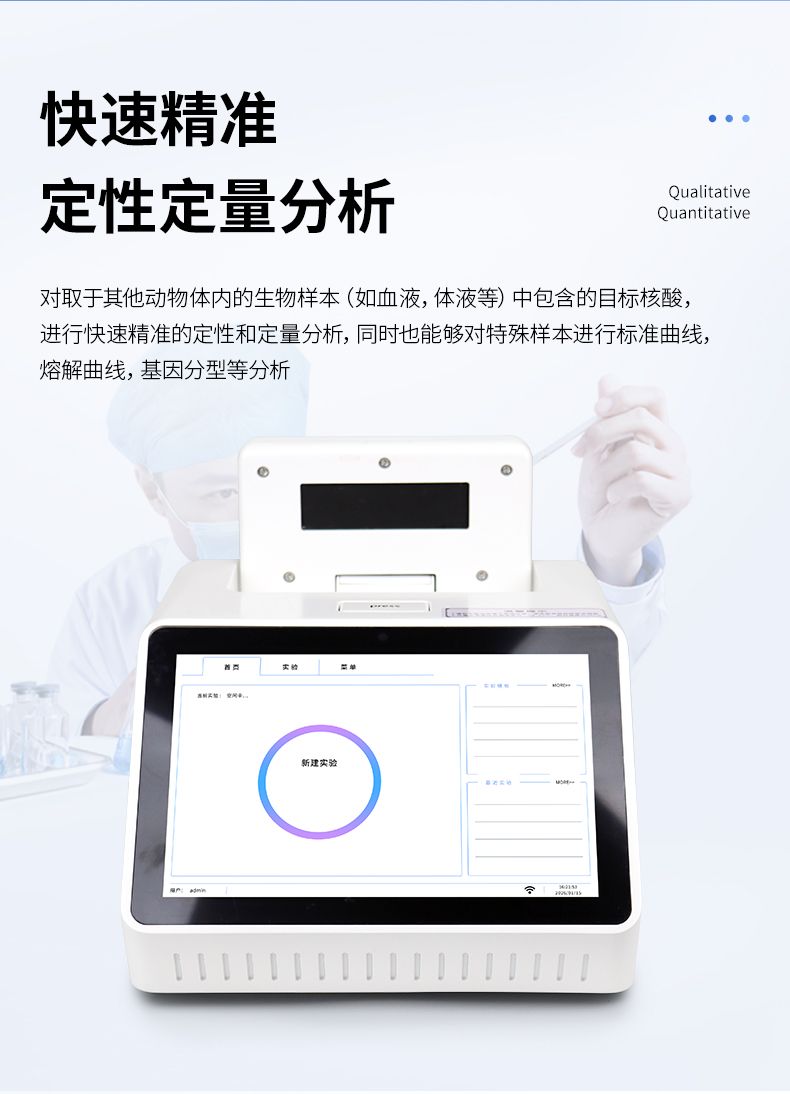 对取于其他动物体内的生物样本(如血液,体液等)中包含的目标核酸,进行快速精准的定性和定量分析,同时也能够对特殊样本进行标准曲线,熔解曲线,基因分型等分析。