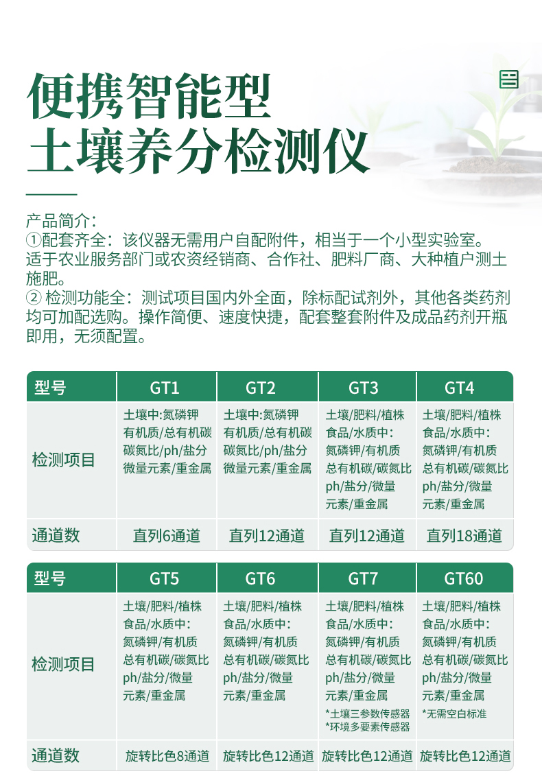 配套齐全:该仪器集药、器、仪为一体,携带方便,相当于一个小型实验室。适于农业服务部门或农资经销商、肥料厂商测土施肥和鉴别肥料真假。