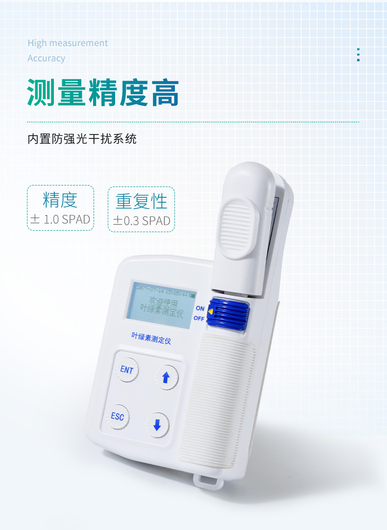 2.测量精度高(精度:± 1.0 SPAD,重复性:±0.3 SPAD)