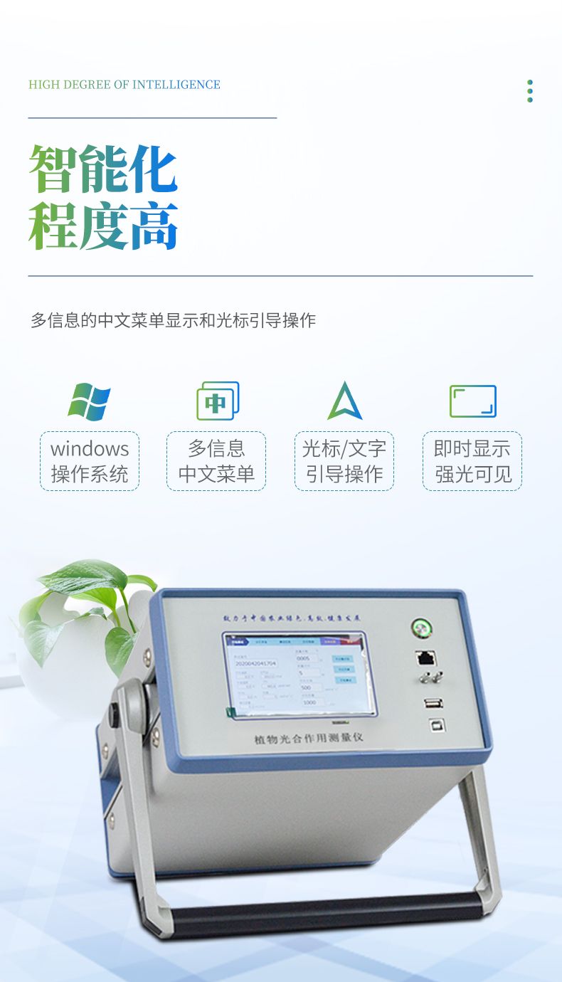 多功能:同时测定光合速率、蒸腾速率、胞间二氧化碳浓度、气孔导度和水分利用效率,以及二氧化碳浓度、相对湿度、光合有效辐射和空气温度、叶片温度十项指标