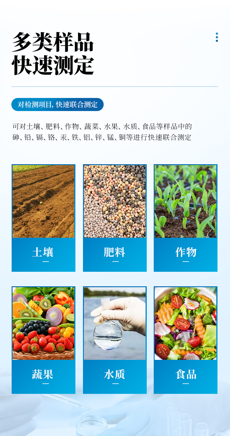 可对土壤、肥料、作物、蔬菜、水果、水质、食品等样品中的砷、铅、镉、铬、汞、铁、铝、锌、锰、铜等进行快速联合测定。