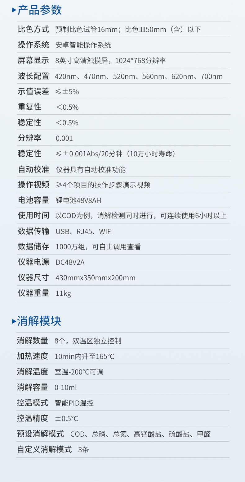 分光模块:COD、氨氮、总磷、总氮、磷酸盐、六价铬、总铬、镍、总镍、铜、总铜、锌、总锌、铁、总铁、锰、总锰、砷、总砷、二氧化硅、苯胺、硝酸盐氮、亚硝酸盐氮、总氯、余氯、氯离子、镉、铅、钛、钒、银、铝、硼、锡、铍、钡、锑、汞、钴、高锰酸盐指数、硫酸盐、氟化物、硫化物、氰化物、总氰化物、挥发性酚、甲醛、双氧水、阴离子表面活性剂、色度、浊度、悬浮物、溶解氧、有效氯、尿素等几十余种。