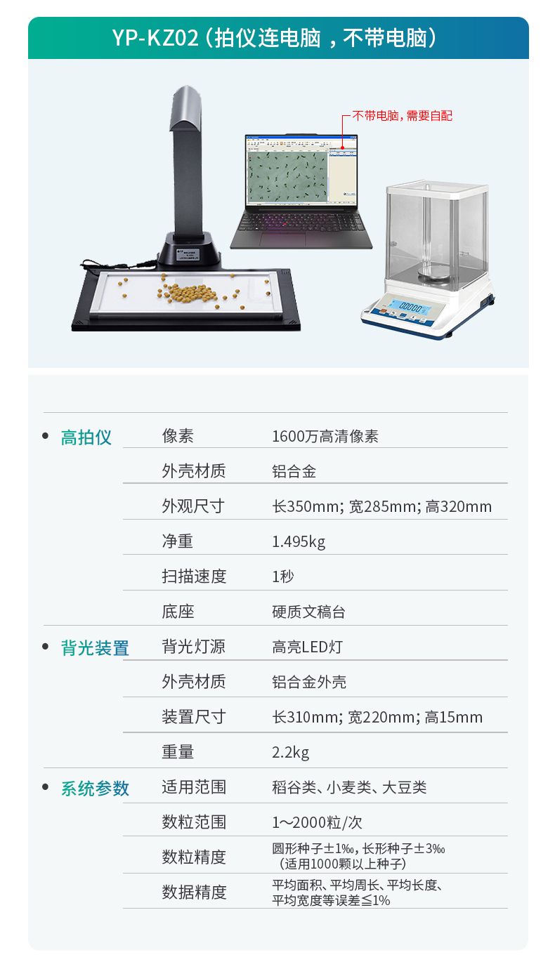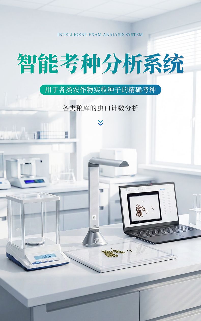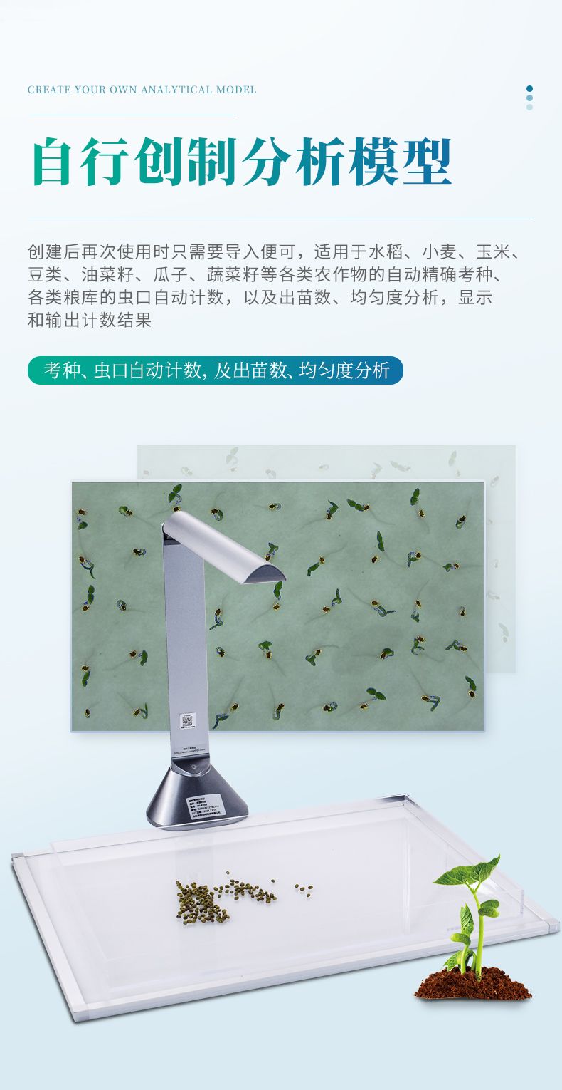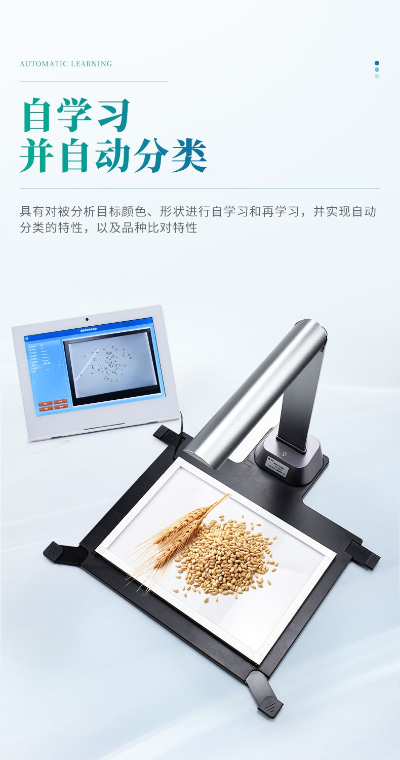 智能考种系统可以测量各种表面光滑的籽粒的数量、千/百粒重与平均粒型(包括长、宽、长宽比、周长、面积),利用图像ORC 识别技术、图像定位、空间转换等技术实现快速识别种子数量及作物性状指标。