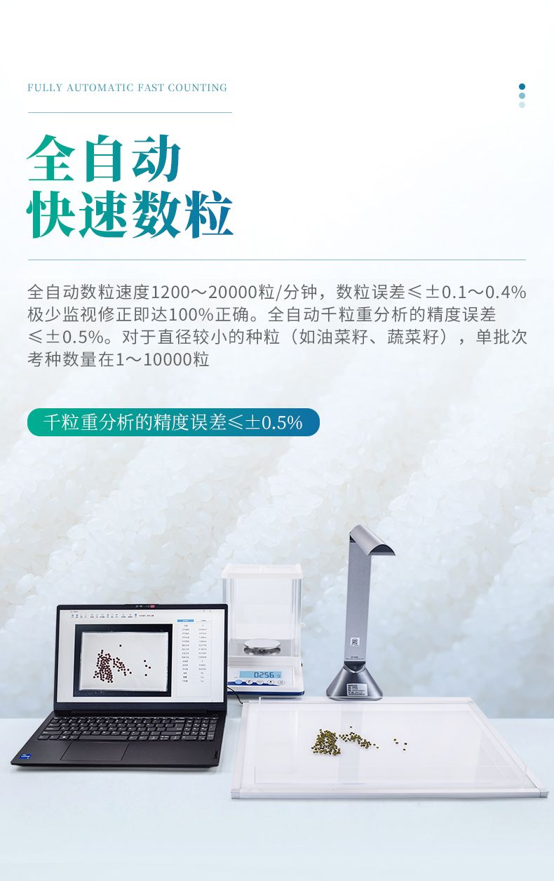 3、数粒精度与目标大小:1~2000粒/次,数粒误差≤±0.1%-0.4%,极少监视修正即可保证结果准确性。千粒重分析的精度误差:≤±0.5%;