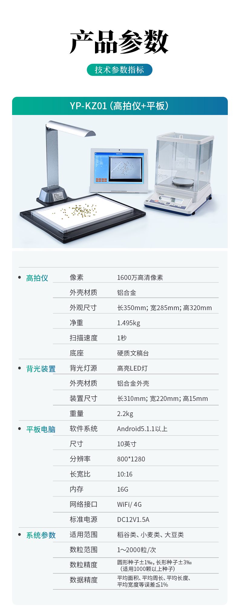 智能考种系统由1600万高拍仪和背光装置组成。背光装置采用的是高亮LED灯,外边框使用铝合金材质制成。软件采用先进的图像处理技术,根据距离变换原理、形态学、凸包检测等技术综合设计的一款嵌入式软件。该设备主要应用在农业领域的田间作物测产及考种等方面,通过高拍仪拍摄的照片,软件自动计算种子数量,种子的面积、周长、长度、宽度、长宽比等数据,根据天平所得的重量与种子的数量自动计算出千粒重;以列表和图形的方式输出结果,便于用户查看与分析研究。本产品也可以手动对作物种子数量修正以确保计数精度、对数据进行保存,并且可以查看数据报表,最后可以将数据以Excel格式导出。
