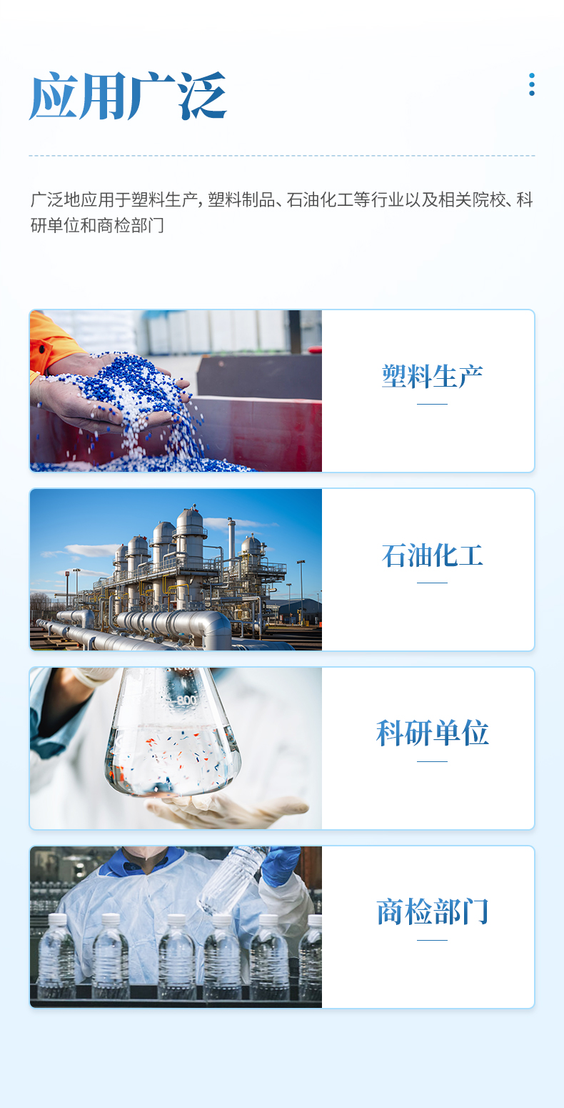 本仪器是用来测定各种高聚物在粘流状态时熔体流动速率,它既适用于熔融温度较高的聚碳酸酯、聚芳砜、氟塑料、尼龙等工程塑料,也适用聚乙烯、聚苯乙烯、聚丙烯、ABS树脂、聚甲醛树脂等熔融温度较低的塑料测试,广泛地应用于塑料生产、塑料制品、石油化工等行业以及有关院校、科研单位和商检部门。