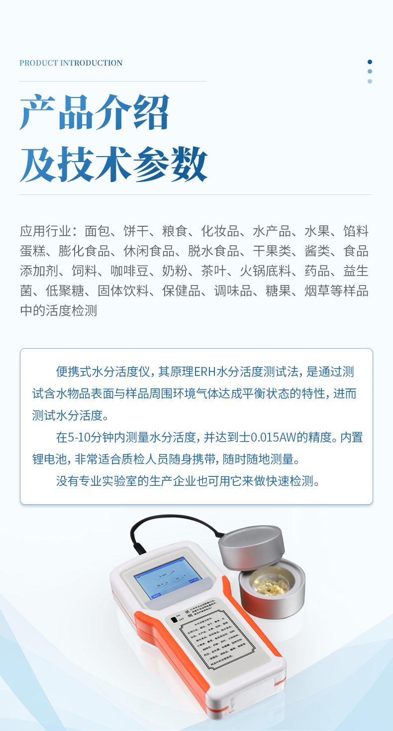 便携式水分活度仪,其原理ERH水分活度测试法,是通过测试含水物品表面与样品周围环境气体达成平衡状态的特性,进而测试水分活度。在5-10分钟内测量水分活度,并达到士0.015aw的精度。内置锂电池,非常适合质检人员随身携带,随时随地测量。没有专业实验室的生产企业也可用它来做快速检测。