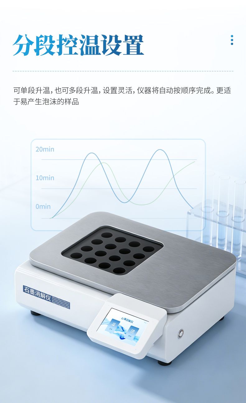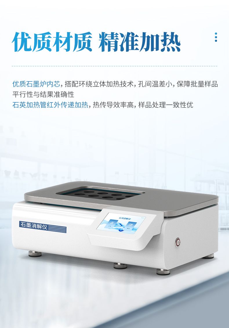 石墨消解仪采用优质高纯石墨材质,结合精确的环绕立体加热技术,确保消解孔间温差极小,有效保障了批量样品处理的平行性与结果准确性。智能PID温控系统支持高精度程序升温,用户可灵活设定并存储多组消解程序,操作简便,重现性极佳。同时,仪器具备超温保护、漏电保护等多重安全机制,配合耐腐蚀设计及友好的操作界面,在提升实验效率的同时,全力守护实验安全。