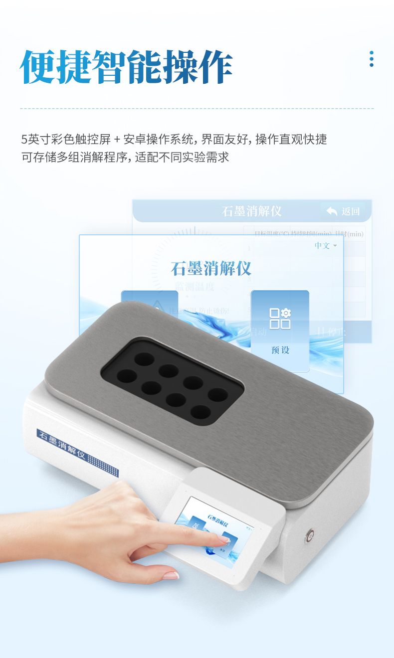 石墨消解仪采用优质高纯石墨材质,结合精确的环绕立体加热技术,确保消解孔间温差极小,有效保障了批量样品处理的平行性与结果准确性。智能PID温控系统支持高精度程序升温,用户可灵活设定并存储多组消解程序,操作简便,重现性极佳。同时,仪器具备超温保护、漏电保护等多重安全机制,配合耐腐蚀设计及友好的操作界面,在提升实验效率的同时,全力守护实验安全。