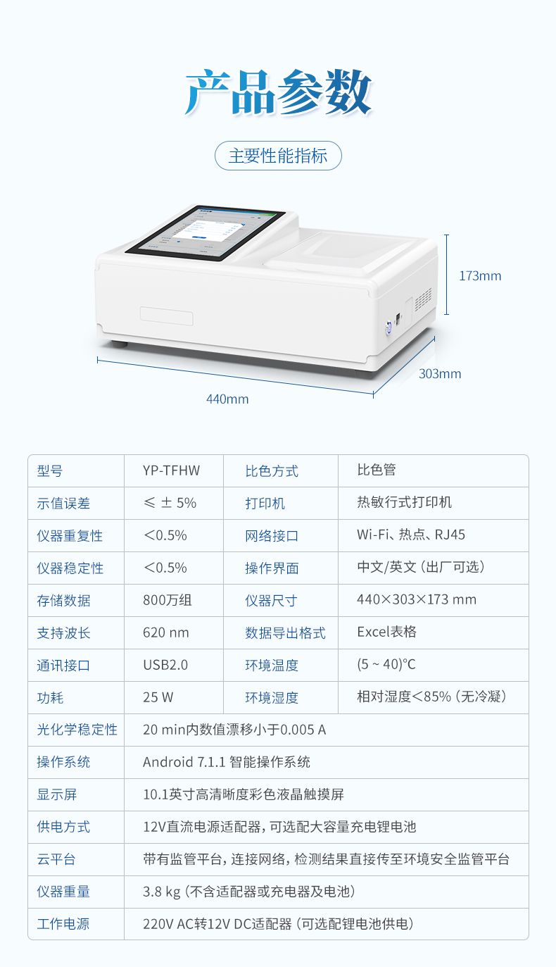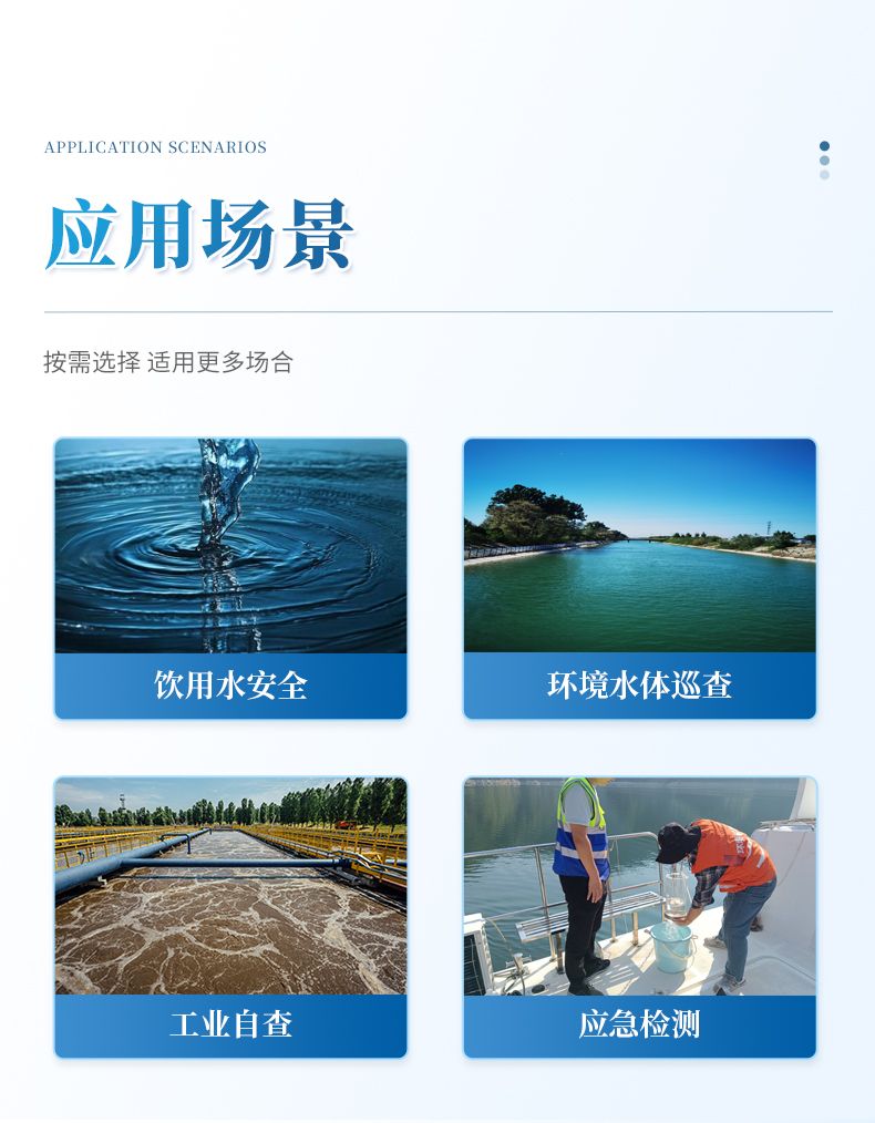 仪器将复杂的实验室分析流程集成机身中,操作简捷,其性能符合国家标准方法要求,适用于饮用水安全筛查、环境水体巡查、工业废水排放监控及应急检测等多种场景,是保障用水安全、实现高效现场管控的得力工具。