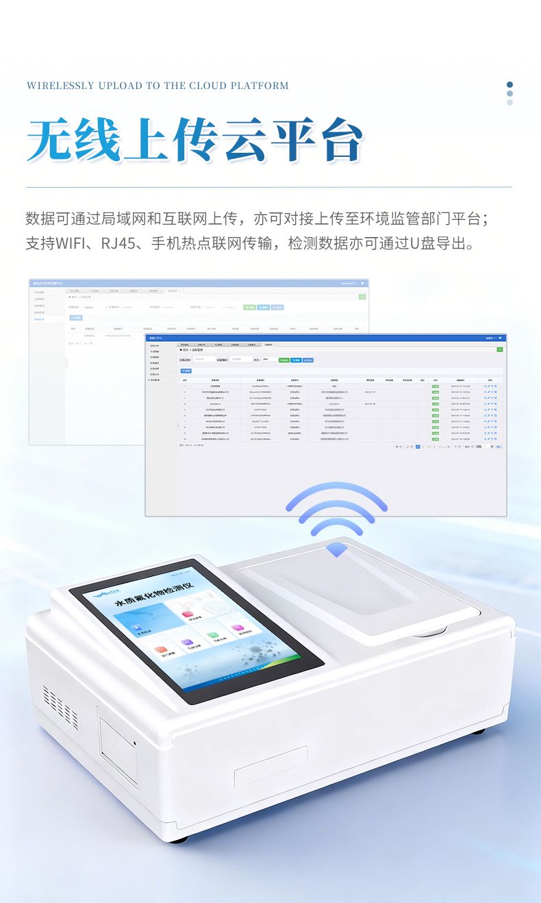8.仪器带有监管云平台,数据可通过局域网和互联网上传,亦可对接上传至环境监管部门平台。