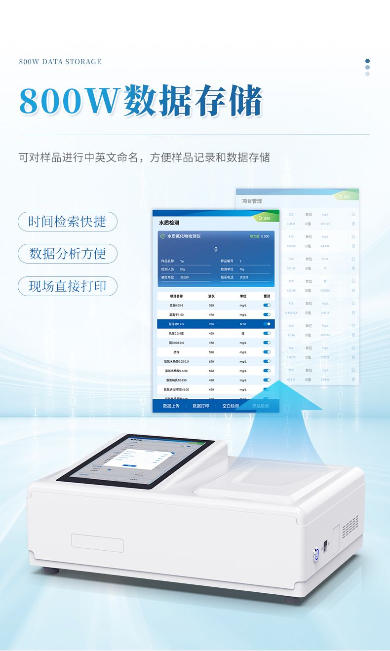 本仪器是快速检测水中氟化物的专业工具,主要服务于环境监测、工业自查、公共卫生保障及科研应急等多类场景。它能够帮助环保巡查人员对河流、湖泊及饮用水源地水样进行筛查;助力电解铝、半导体、电镀等工厂的质检人员对工艺用水与废水排放口实现快速合规自查;协助疾控中心及水厂工作人员评估管网末梢水与农村饮用水的氟化物安全水平;同时也为野外地质调查或突发性水质事件的应急监测,提供即时的数据支持。