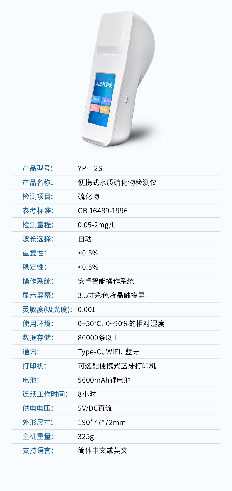 水质硫化物检测仪是依据《GB 16489-1996 水质 硫化物的测定 亚甲基蓝分光光度法》设计制造,主要检测水质中硫化物的含量;本仪器兼具智能数据分析功能,图表、列表显示数据,分析一目了然;高清晰度彩色液晶触摸显示屏,Android智能操作系统,中文显示界面,中英文键盘,人性化操作,使用更简单。