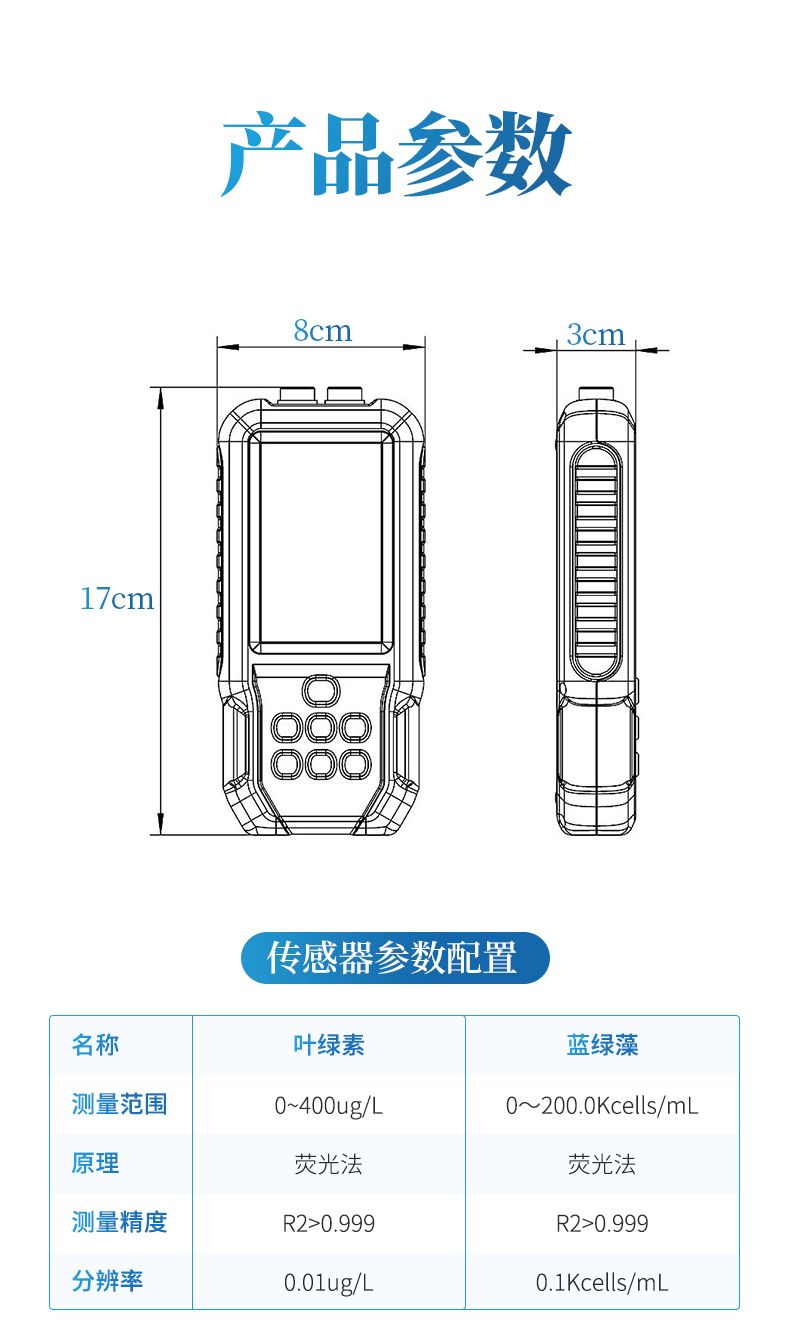 | 蓝绿藻 | 0~200.0Kcells/mL | 荧光法 | R²>0.999 | 0.1Kcells/mL | 带刷子自清洁 |