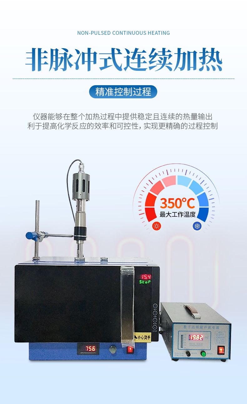 采用最新变频技术,通过变频器将50Hz工频转换为10000~30000Hz可变频率,取代了传统微波反应器使用的高压变压器,完美解决了传统微波反应器精确控温时,高压变压器受尖峰脉冲的冲击,造成变压器频繁损坏的技术缺陷。MCU根据Pt100传感器实时检测到的温度变化数据、反应物质极性、热容变化、反应时间等数学模型的变化条件,自适应PID调节,自动变频控制微波输出功率,从而精确控温。