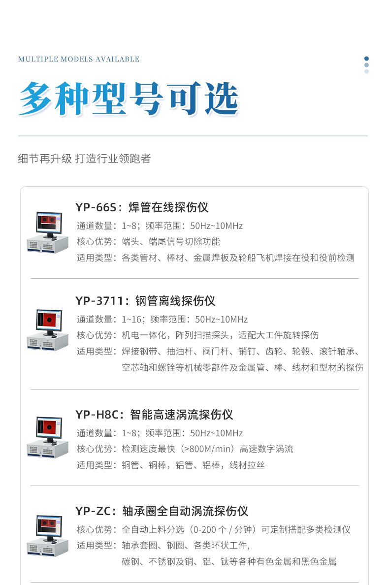 H8C智能高速涡流探伤仪是集数字涡流技术、微处理器技术等领先技术于一体,其检测速度高达800米每分钟。采用WINDOWS操作平台使仪器使用起来更为智能简便。仪器性能稳定、灵敏可靠,可实现自动化、检测速度快。专用于高速检测金属管、棒、线材的在线高速探伤的涡流检测设备。